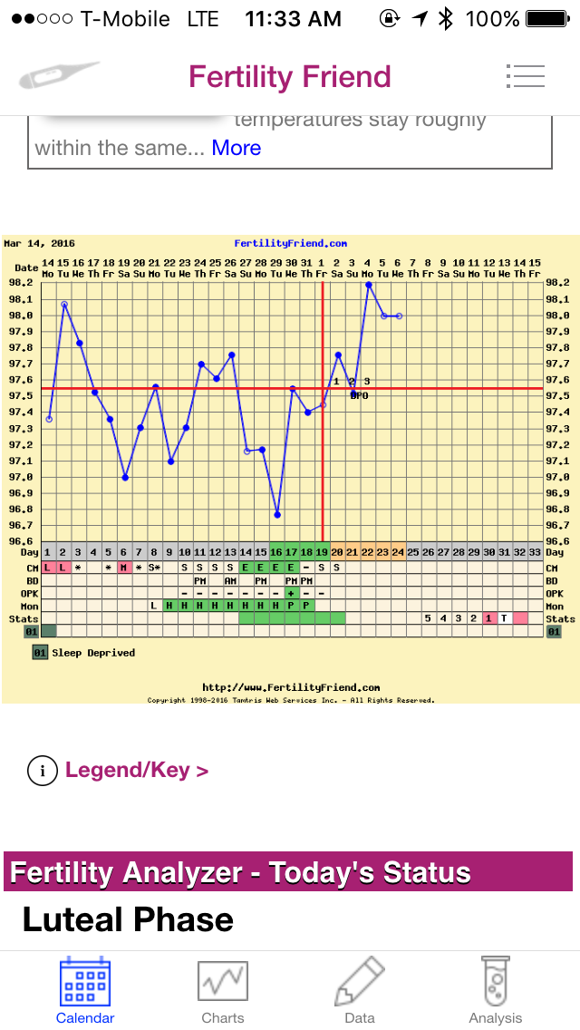 if I put in 98 (a normal ish post o temp for ) for the next two days, it actually gives me solid ch on CD 19. I did stop using the cheapie OPK after a few days when I saw them getting lighter again. With the digi it basically locks up with the solid smiley for two days. On the plus side, tomorrow is our anniversary... So there is BD to be had. Unfortunately I left town This weekend so we could do anything.