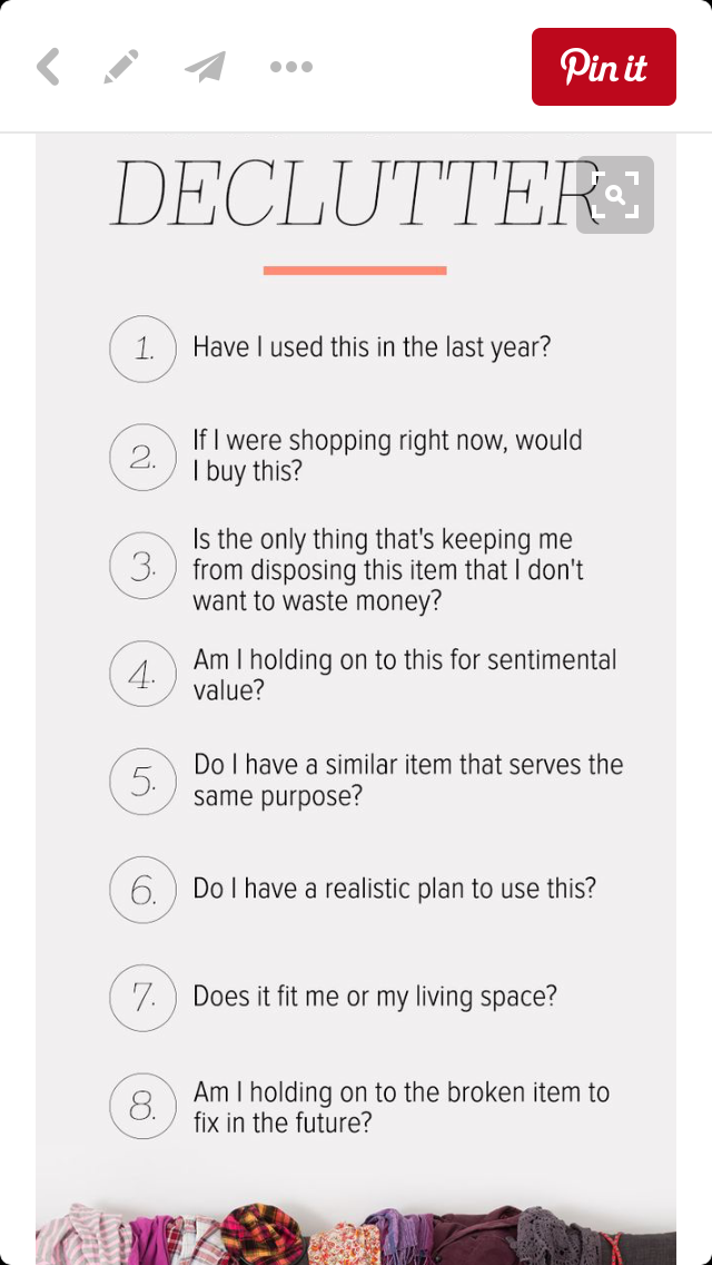 @dayj11 - I love that declutter list! But for me, #3 is always a challenge. I can't help thinking, "Maybe I can use this item in the future...", and then I'm afraid I won't have the item when I need it. Buttttt, that time NEVER comes!