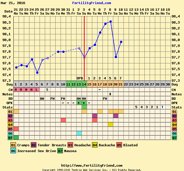 R/R/CS: I did start spotting a tiny bit yesterday, as usual. But my temp is still high, when normally it would have started to decline. So I'm not giving up hope yet!