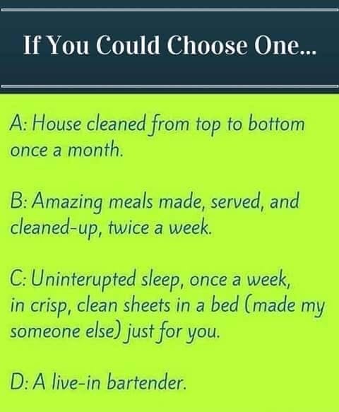 Edit to add: @Megzb510 I choose B! I don't mind cleaning my house and the live in bartender would be nice, but I am not a fan of someone being there all the time.