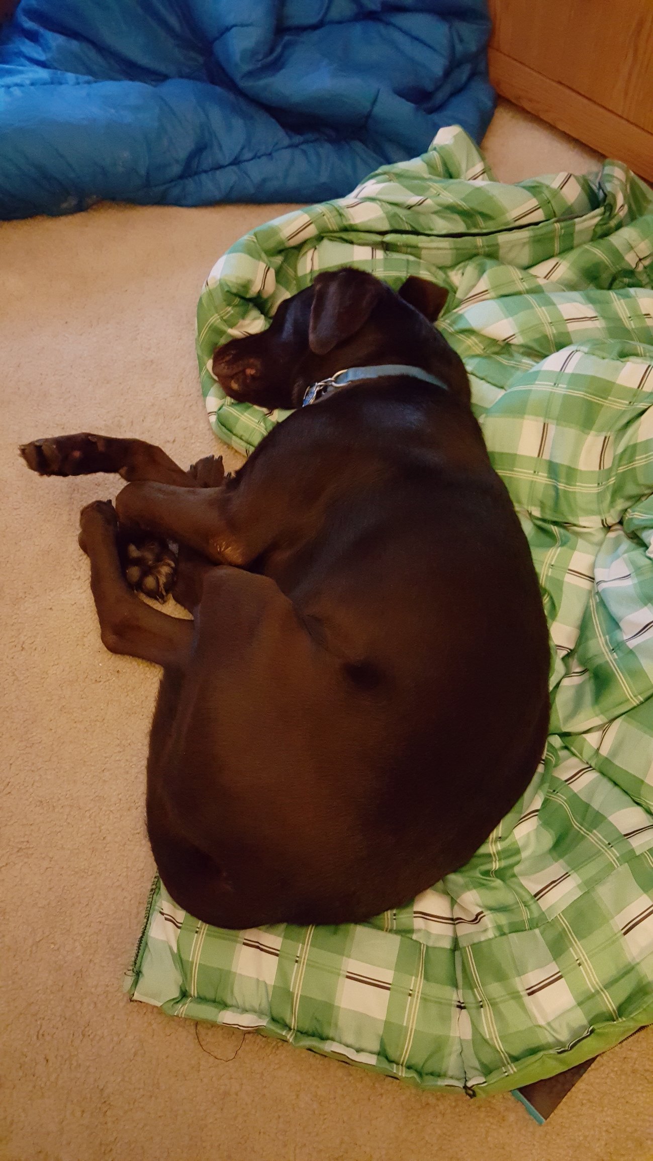 Thank you! We call him our Dark Chocolate lab. And that is a sleeping bag he is on. Never mind there is carpeting in the room, he wants something even softer to lie on. He's such a dork, but we love him :smile: