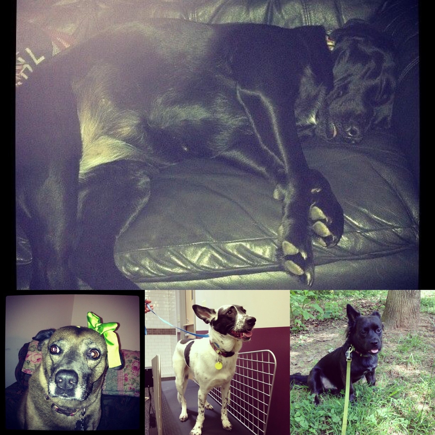 • These are my furbabies. Pic of my lab, Luna age 7, has too much sun but I still love her smooshed face. Lucy, my mutt age 8, isn't enjoying her bow. My short haired Border Collie mix, Keely age 6, is my shadow. And then my boy, Max age 4. All of them plus a 22 month old DS makes for a busy household but I love it! They all do great with DS...well Luna still runs away when he comes towards her but other than that they are good haha.