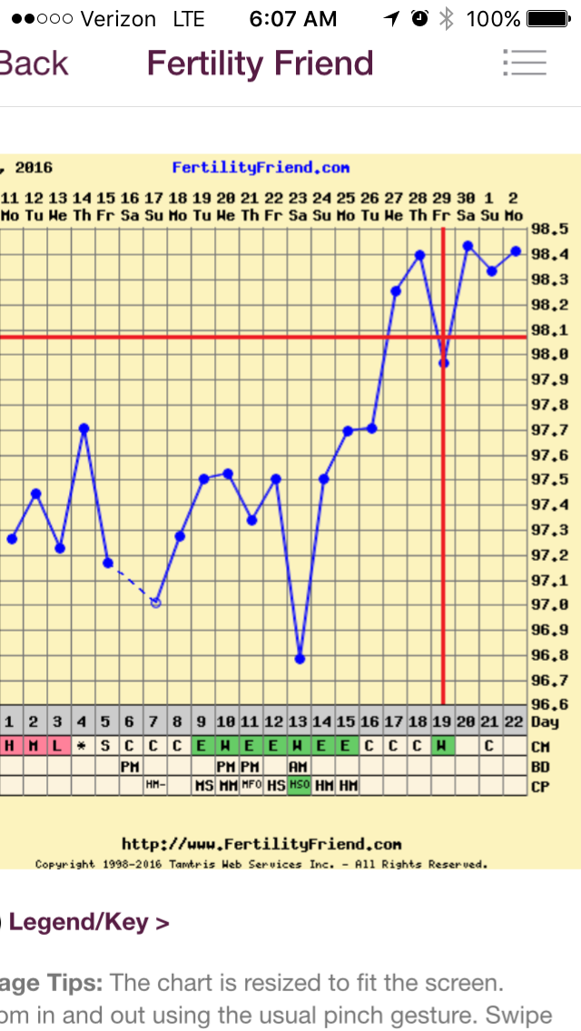 R/R/CS: FF changed my crosshairs several times. (At least now I know what the dashed and solid lines mean.). I don't even get the latest interpretation since not all the temps are above the cover line. And with that interpretation, our timing is non-existent. (Posted it above---anyone disagree?). AND, the things that seem to be making it change dates this time (continually higher temps/jump with patches of fertile CM) didn't make it change O dates last time, even aftwe it's anaylsis put me with a 20 day LP when all was said and done. Also during the time since we thought we had already O'd DH has become convinced that we should wait to TTC another 6 months or so because his work has been stressful. Wtf DH... Already been waiting a year. Also I started off my morning by accidentally posting in yesterday's TWW thread. This is all a great start to the week.