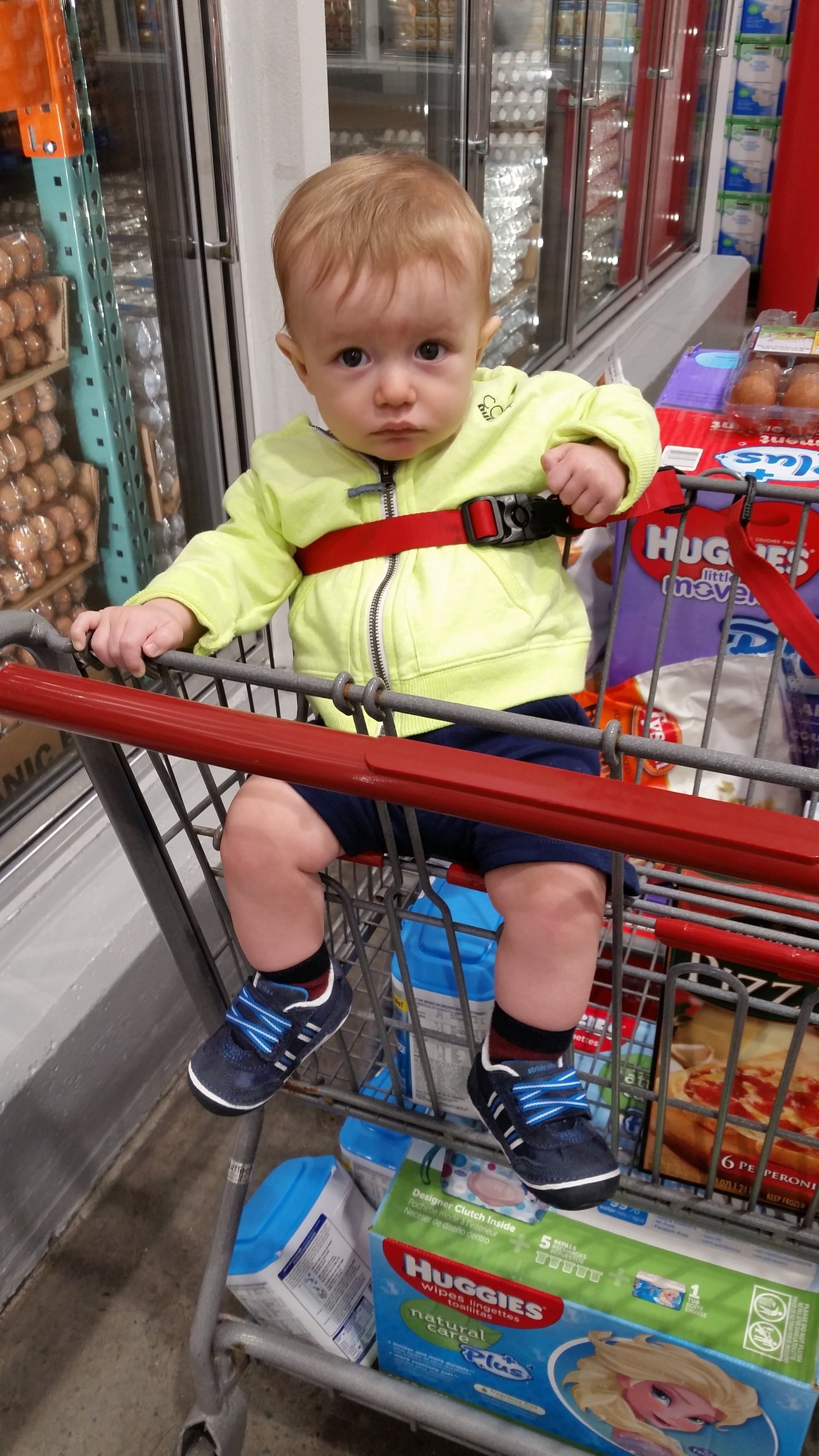 He looks so big! Mine wear a size 2. Love the way he's sitting in the cart lol.