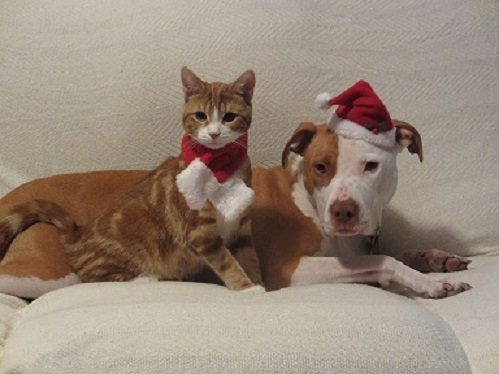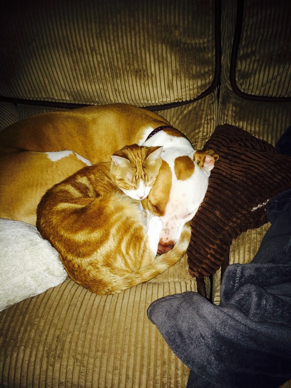 I was having a sad day and came across this thread and decided to add a couple of pics of my little cuties - mainly because I will use any excuse to show them off! The first is how they used to sleep (my husband would catch them like this at 5 am) and the second was the first Christmas card we sent out after we got the cat.