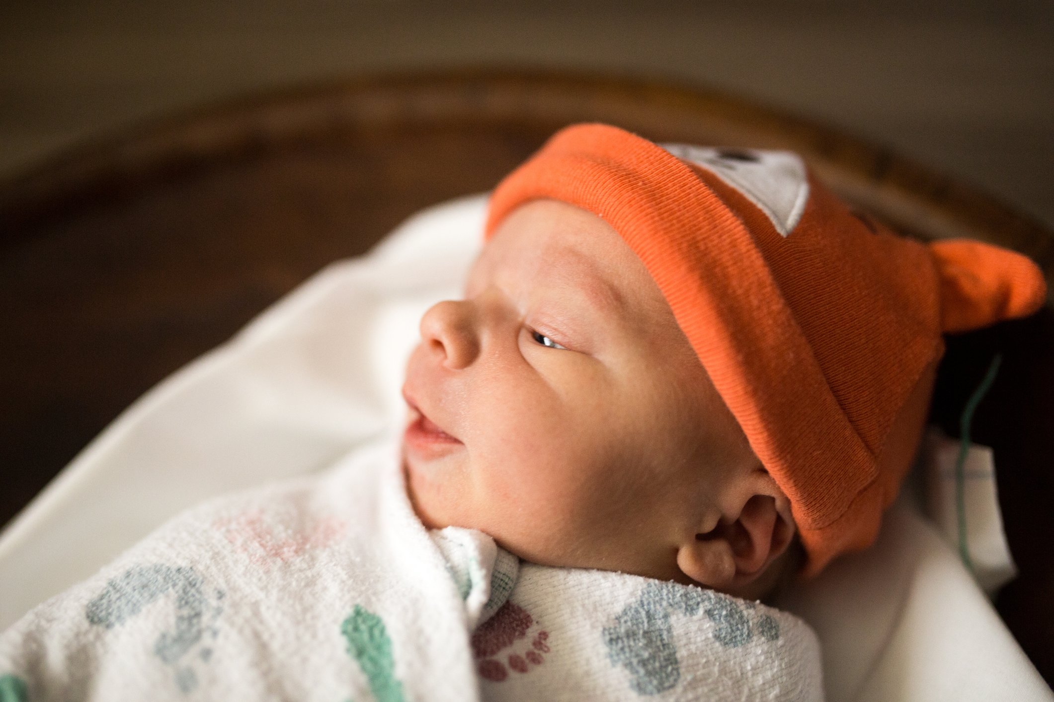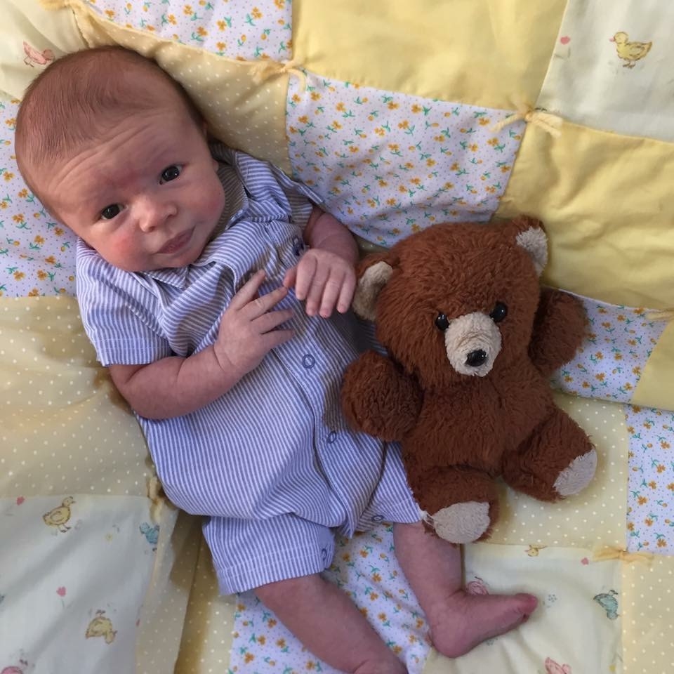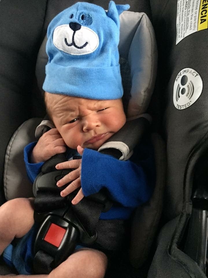 5 days old in the puppy dog outfit. (We put him in the car seat and when we got to the doctor's office that is what he looked like- I swear he had mittens and socks that somehow managed to come off as well as his halfway off hat.)