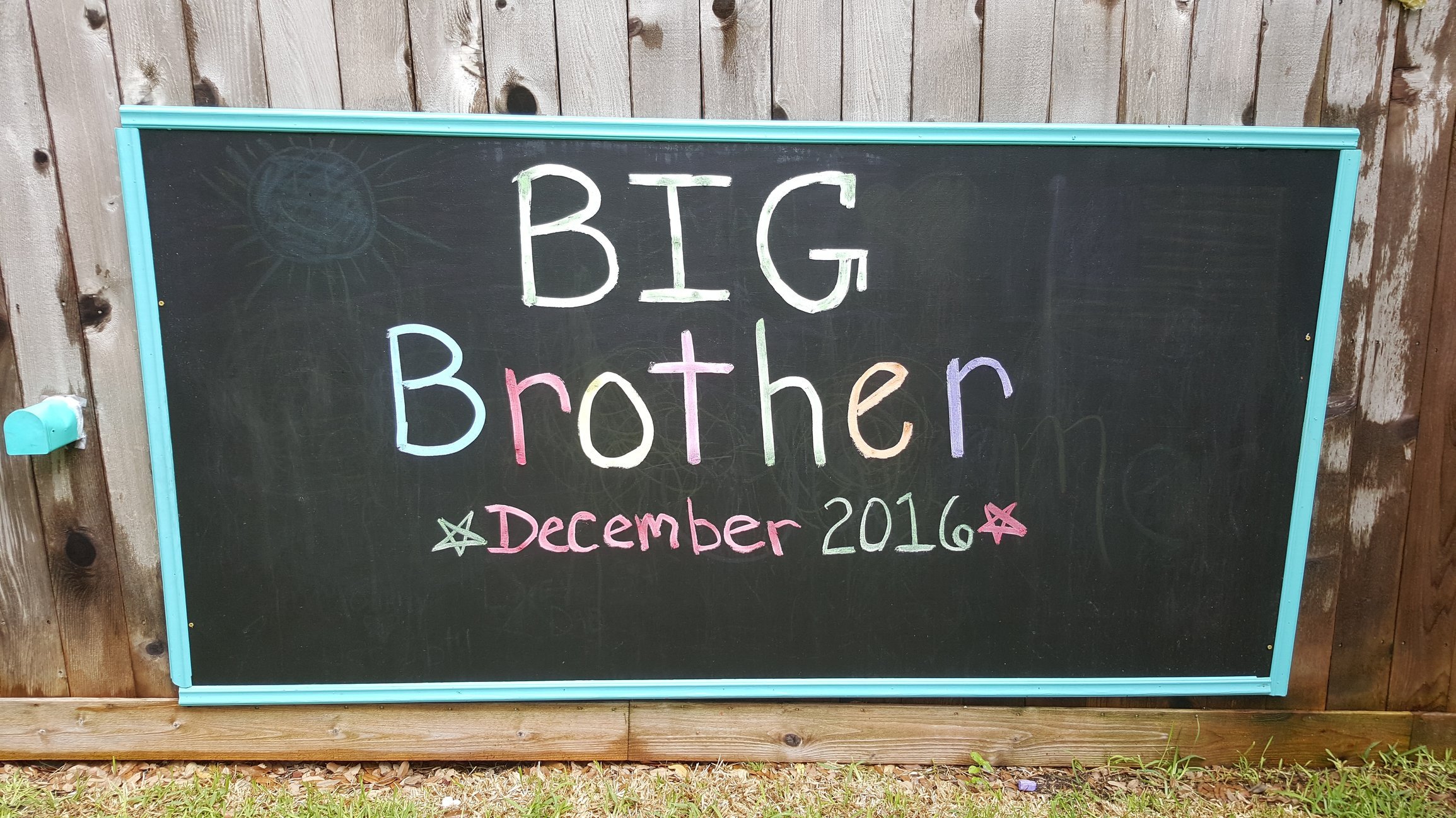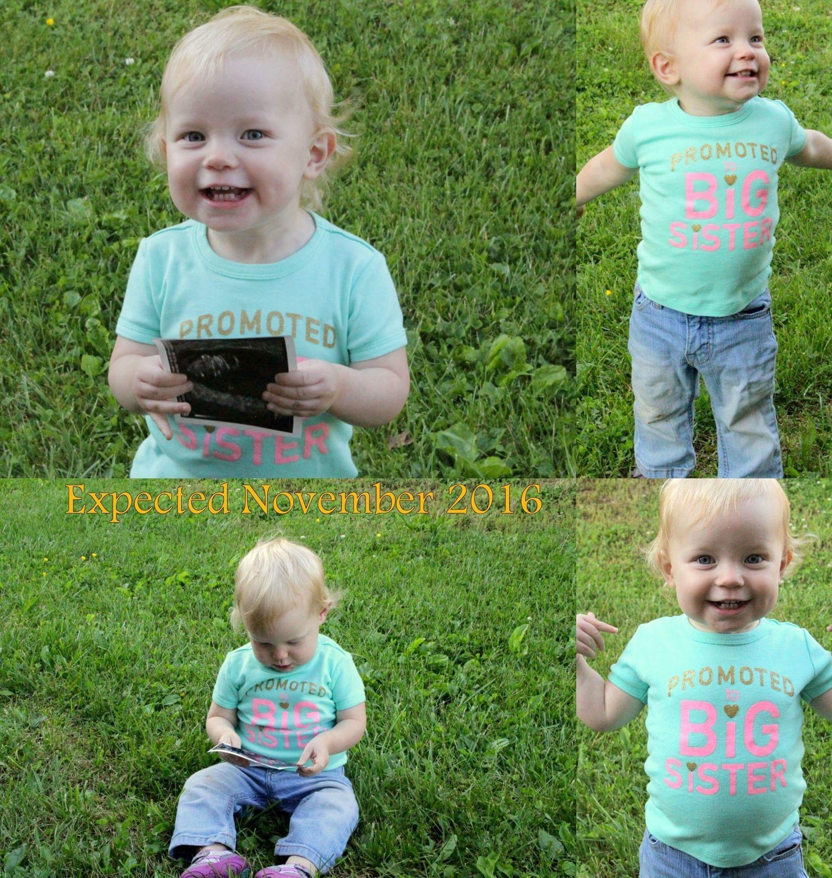 Finally put together an announcement at 14+2 and made it Facebook official at 14+3 since I'm starting to show and I'd rather not have people think I'm getting chunkier lol also announcement ideas are much easier with one kid when you can slap a big sis shirt on