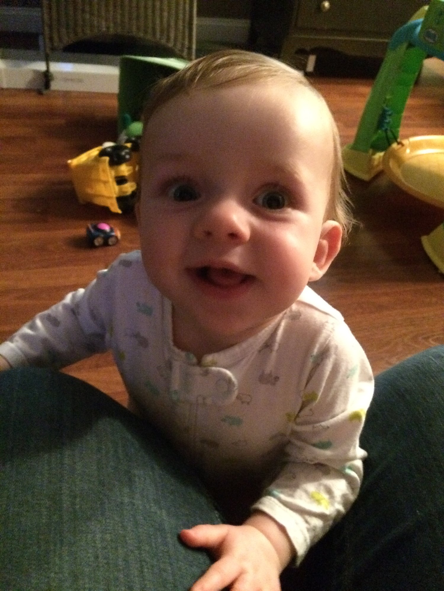 Greyson will be 9 months on the 15th. No teeth yet but crawling, pulling up and standing, just started crusing, ha he loves to clap.