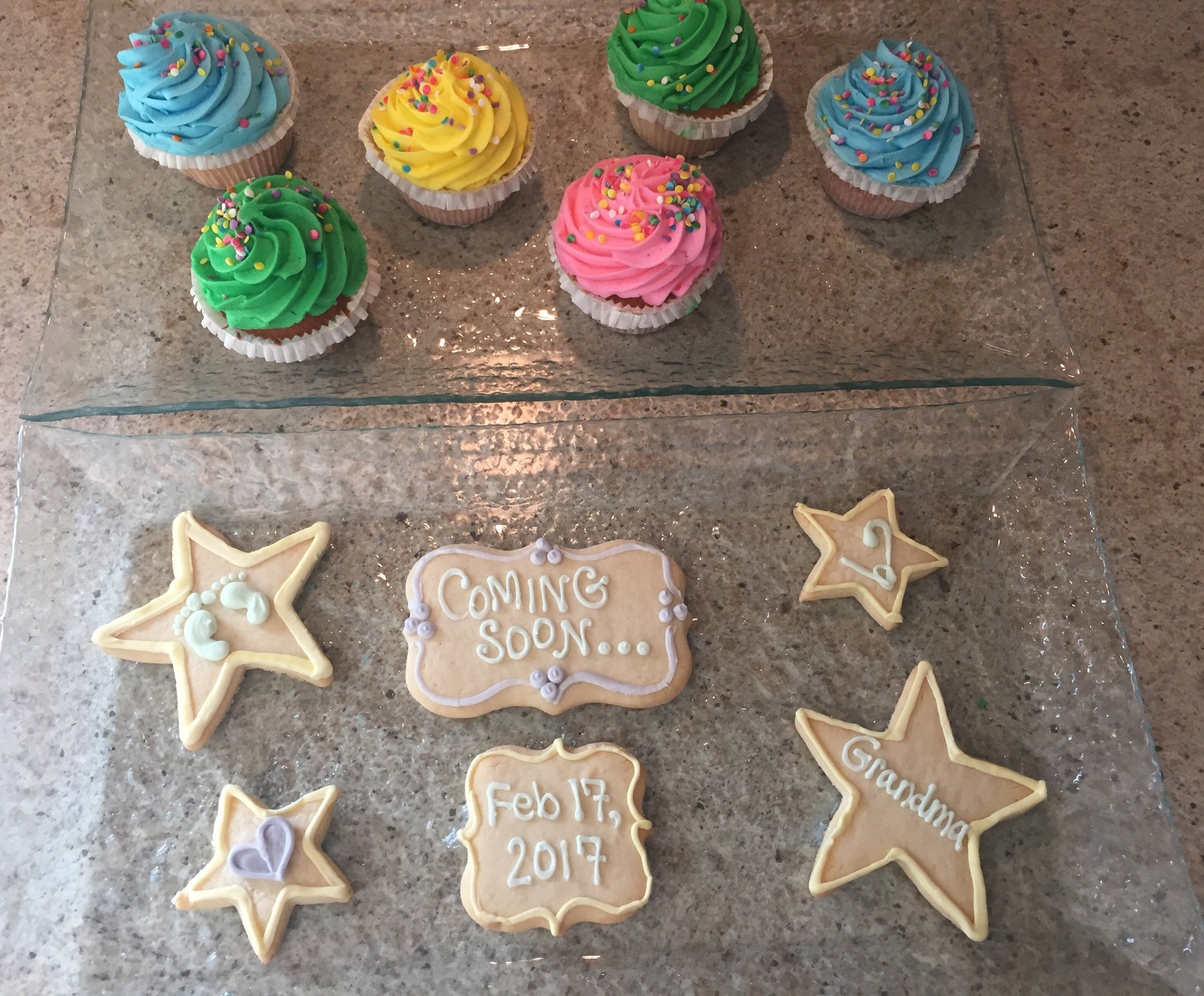 So during my lunch break, I quickly ran to the nearest bakery and grabbed these cupcakes, and my husband ran to a different bakery and had them mock up these cookies. They didn't turn out nearly as cute as they are in the original pic, but they turned out ok, and they did the trick!