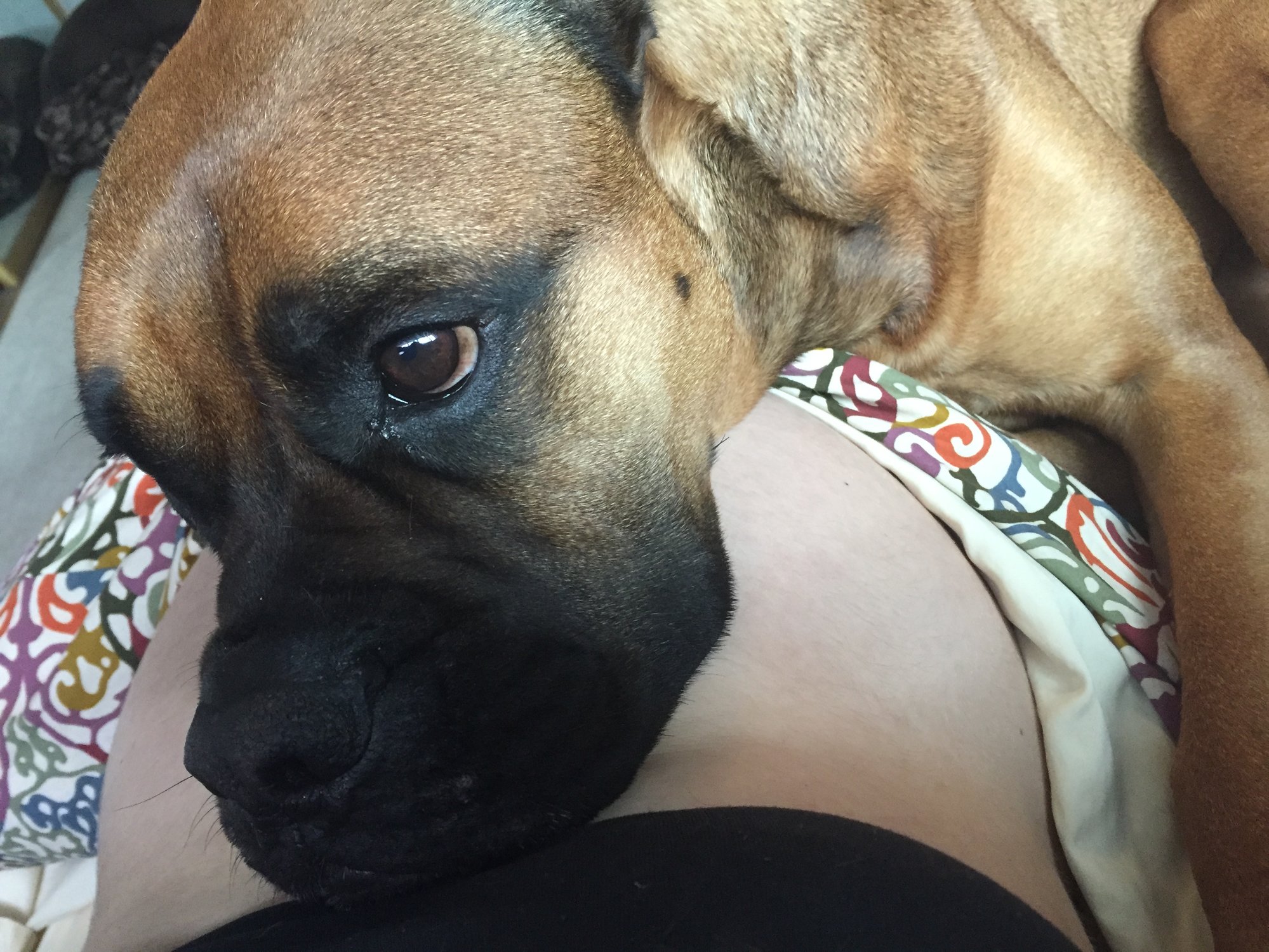 • Yep my dog is in the weird boat too. Part of it may just be that I'm home now that I'm done with work, so it may not be totally pregnancy related, but she gets really antsy and follows me around everywhere when I'm doing chores or whatever. Except for rare days like today, when she is completely ignoring me. She picked a great day for that because I have a lot I want to get done and she drives me nuts when she's clingy while I'm trying to get crap done! She's too big for that nonsense!