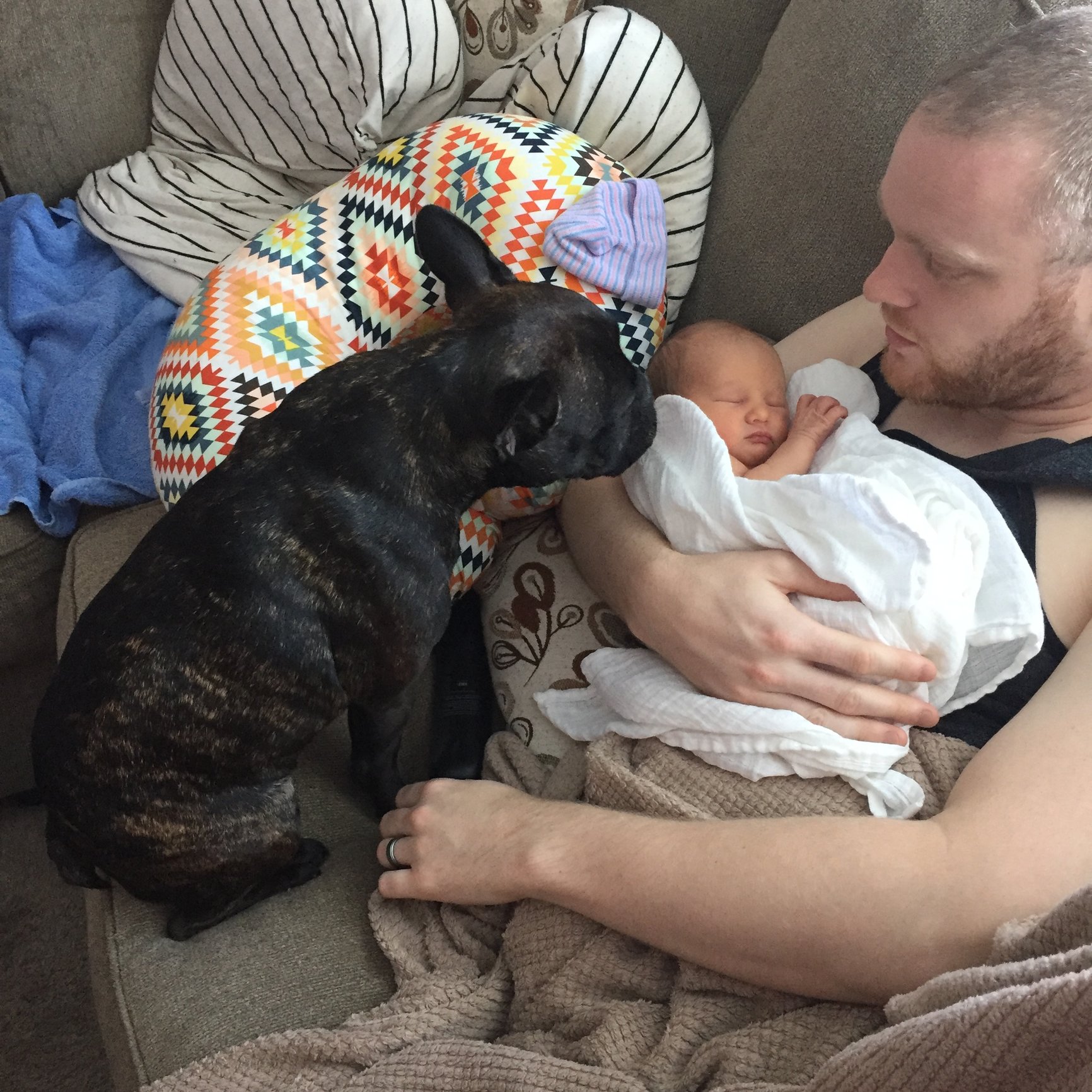 Hank is pretty uninterested which surprised me! He seems startled every time he sees Elliott which is funny. He has been great with me and my incision which I am thankful for because he's such a tank. I can see him really loving E when he's bigger and dropping food...