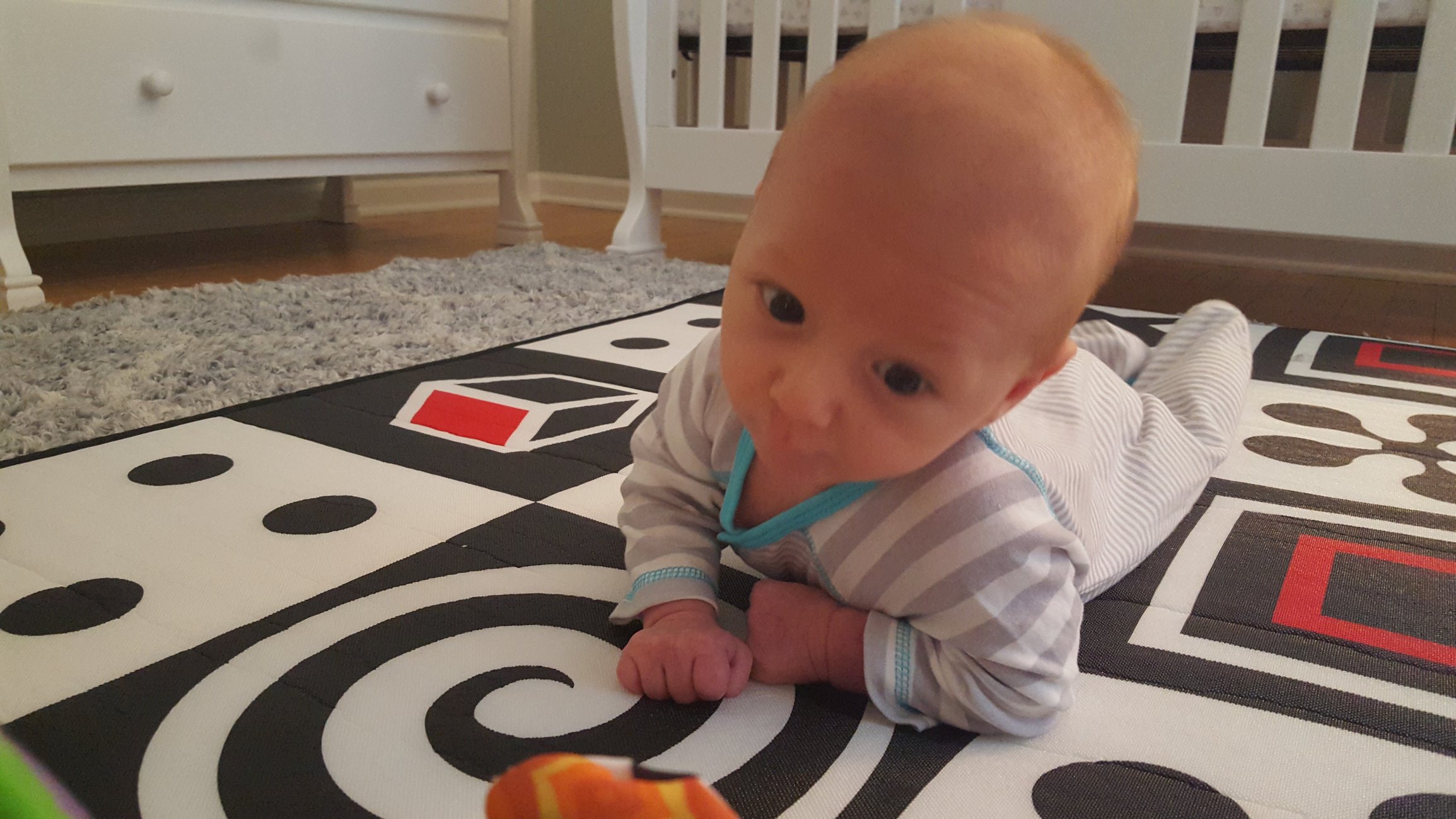 We have a tummy time mat with lots of colors and a detachable mirror and a little pillow that LO can prop himself up on. We try to do two 15 minute sessions a day but if he is getting super fussy, I usually stop and try again later once he has calmed down or will lay down and do tummy time on me!