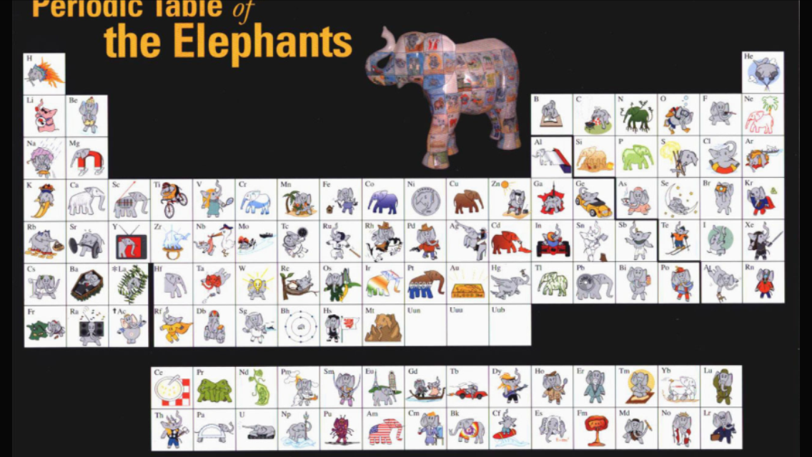 • We were originally thinking something fun like robots or dinosaurs but then we remembered we have an old poster from when DH taught high school that's a periodic table of elephants so we might switch to elephants and use it.