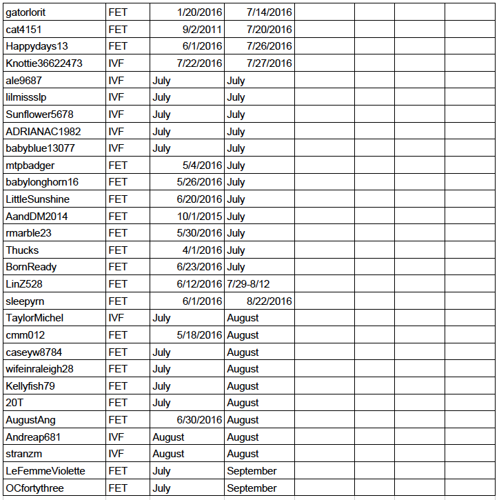 @wifeinraleigh28 hi. We did ivf in june...late comer to find this group.. I'll give a lil background. Dh and I married 7/7/07 been together since 2002. Ttc since 2008. We started the whole ivf process due to mfi. Long story short we had egg retrieval 6/4. 15eggs, 10 were mature, did Icsi on all 10 and 6 made it. Transferred 2 on 6/7 anf froze remaining 4. 6/20 BCP 323 6/22 BCP 1497 awaiting u/s on 7/7.... Just want say thanks to all as u seem to all be soo supportive during this hard long process!