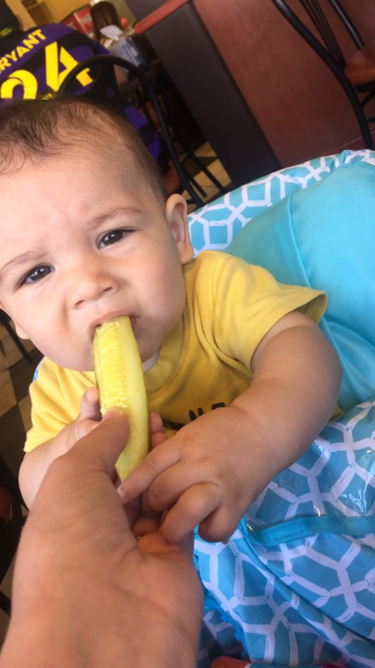 Show me a baby eating real food.