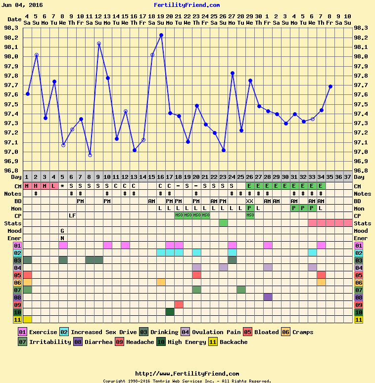 @Saralee797 Your chart looks interesting and I wonder, were we talking about this before? What kind of fertility monitor/opks you are using? Mine, once I get a peak just shuts off for 48 hours and that's it until the next cycle. I find it interesting how when the EWCM starts to appear, your temps smooth out, so that's a good sign that if you legit had rocky pre-o temps, it was like those were just your PRE-pre-o temps, and now these are smoothing out perhaps leading up to O? I know mine will be a bit rocky during AF and pre-o, usually dip and then go up after O and kind of smooth out somewhat like yours do later in your cycle, and then ideally you want to see them rise, which they have been over the past few days..., so like if it weren't for where those smoother temps are sitting in relation to what would be some kind of coverline for your earlier temps, (and all the other signs like CM/OPKs etc. further confusing things), I would almost say it looks like you could have O'd on CD25, - and you DID have a peak reading there - let's just flip flop those two ten-day stretches of CM patterns and it would start to make a little more sense. lol That long patch of EWCM HOPEFULLY means your body is gearing up for O, but really only time will tell... :/ Wish I had a better answer, but Keep HIO so you don't miss anything!!!