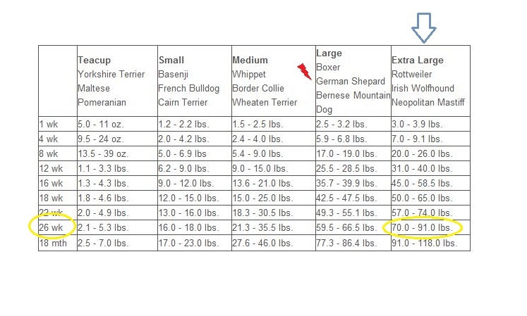 @hezzer78I found this puppy growth chart that's safely projecting him to hit the 100lb mark! (77 is one third of the way between the 70-91 range they give for his current age, and 100 would be one third of the way between 118-91 in the 18 month range.) How does it work when they are legit 150 lbs fully grown? I love it though, but I mean, that is fully OFF THE CHARTS!!! lol <img title="Image: https://us.v-cdn.net/5020794/uploads/editor/a4/elictcxpmpsj.jpg" alt="" src="https://us.v-cdn.net/5020794/uploads/editor/a4/elictcxpmpsj.jpg">