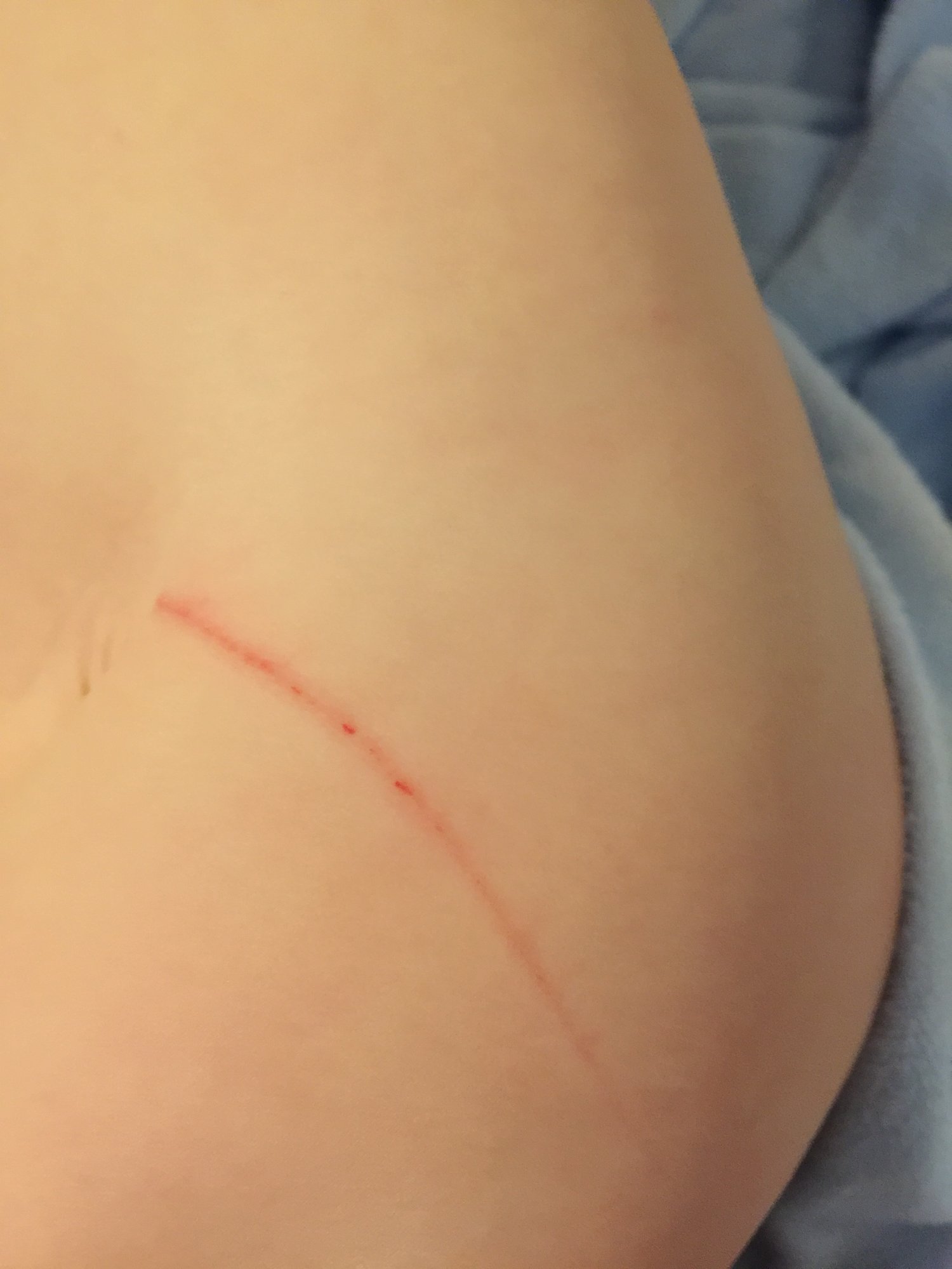 From a diaper being too tight at day care. There is a cut just like this on his other thigh. This was taken after we cleaned up the blood and soaked him in his bath.