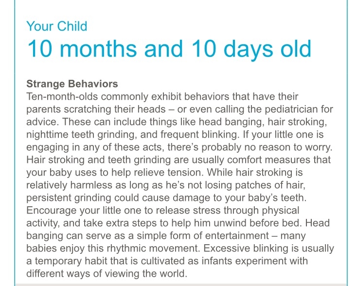 • So as I was reading through my what to expect the first year book, they had a spot that talked about head banging on the crib. I immediately thought of your post! It said it has to do with the rocking motion we use to give them and also the head banging de stresses them. It said more but I read it last night and can't really remember.