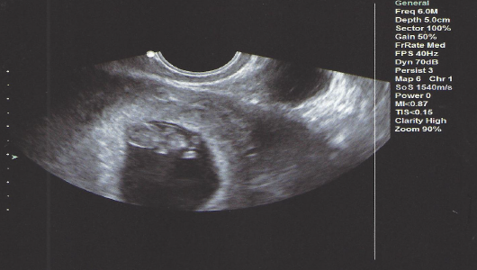 Whoa...seriously rad. 8 1/2 weeks & almost an inch, heart rate is 159. It's little arm & leg nubbins were waving like crazy - looked like it was dancing! So amazing to see it start to look like a baby...