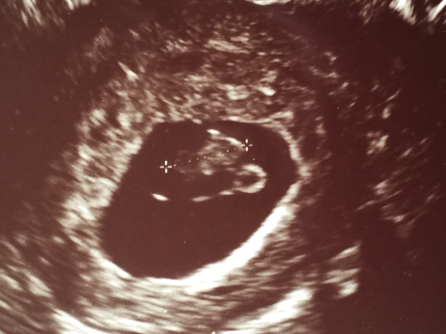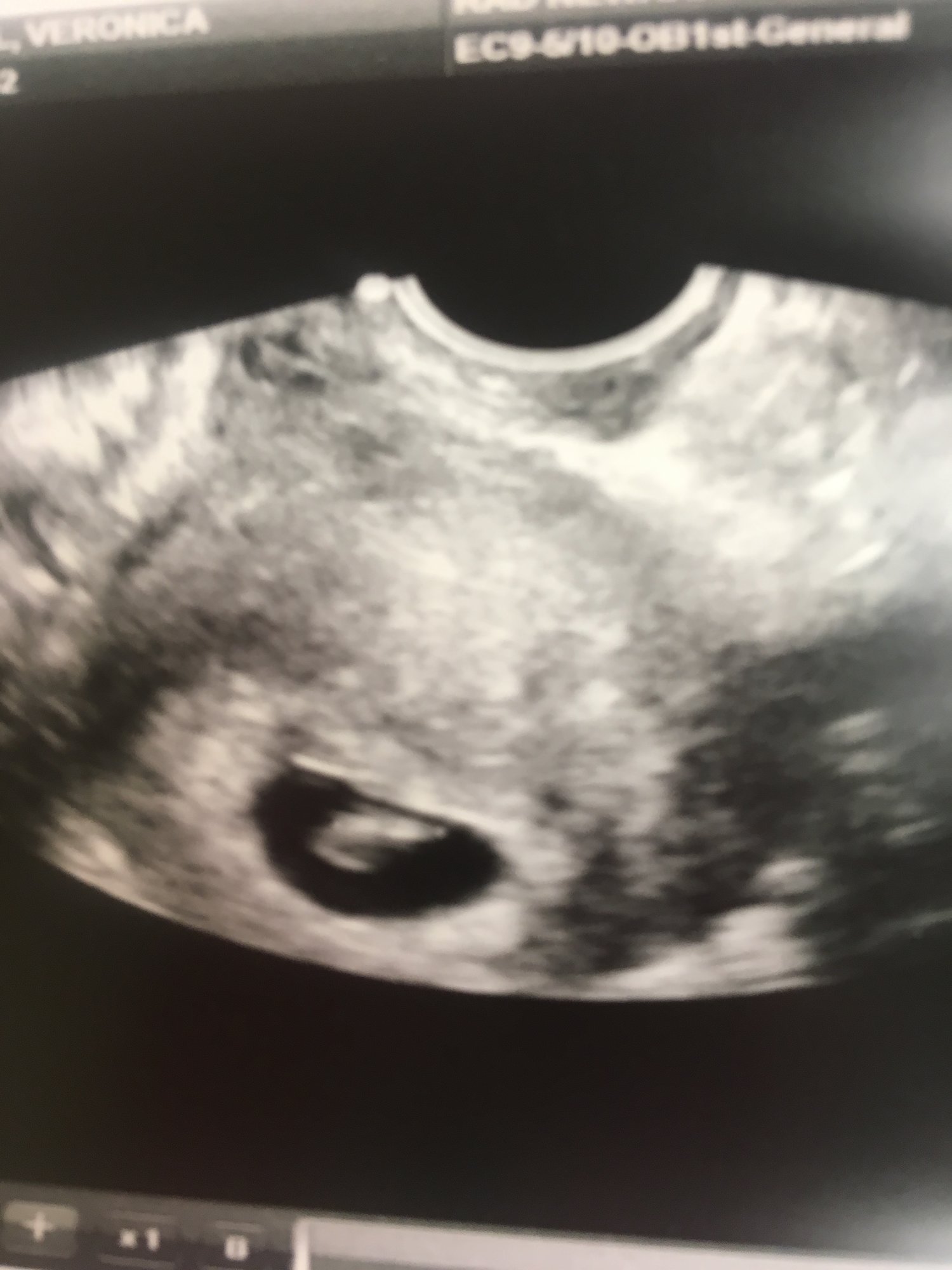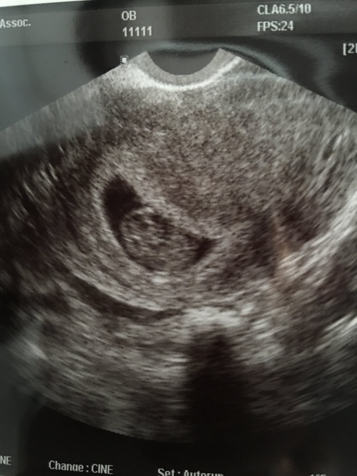 After crazy, intermittent pain the last 72 hours, I ended up with an ultrasound today. Should be about 6 weeks, measuring a little under at 5 weeks 3 days, but she said very typical for measurements to me off this early. We could see the heart beat at 114. It will be more accurate when I go at 8 weeks. Oh and the pain they are pretty sure was a kidney stone... Baby is just fine! It's the little blub under the word!
