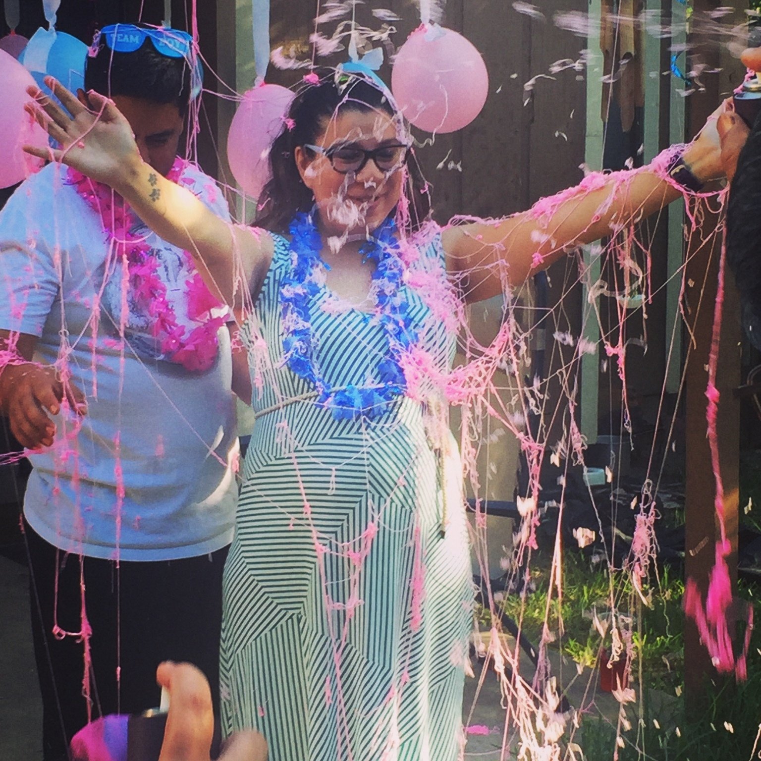 My sister and niece did my gender reveal saturday. Having a girl. I waited about 5 days to find out and it was torture. It was so much fun on that day, they had a pot and made everyone guess before hand and we're either given leis or team boy or team girl glasses. I guessed boy and as you can see by the silly string, it's a girl. No one except my sister and niece knew what color the string flying out was going to be. I am so excited!!!! Winners of who guessed right got a prize. All girl themed...lol