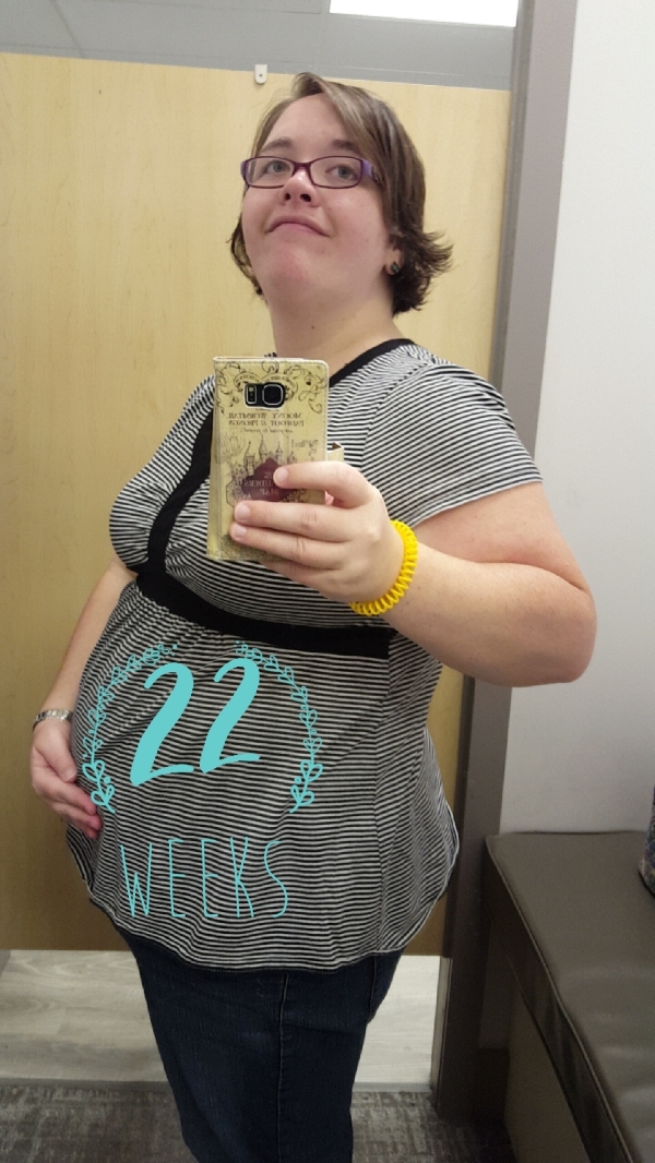 Super late again, but I really wanted to show off my very obvious bump! We've been on a little vacation and my service is spotty, so I haven't been able to successfully post. Anyways, this pic was taken yesterday in a dressing room. My mom and grandmother penned me up in the dressing room of Motherhood Maternity and threw clothes over the door at me. At the time of the pic I was 22 weeks +2 days.