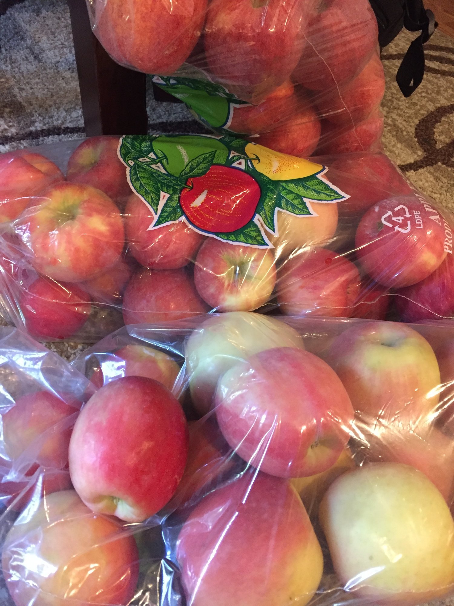 Holy apples, Batman! DH was in Eastern WA for work this week, his parents live over there so he stopped by. FIL works for a fruit co (agriculture is huge out there), and gave DH 3 giant bags of freshly picked apples!!! Honey crisp, Fuji, and Gala! WA is #1 producer of apples in the country, and they are SO good when fresh!!! I ate 2 last night, and 2 this morning.