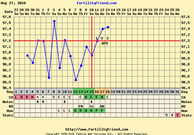 CD: 18 (got crosshairs this morning BUT I am not entirely convinced. CM lines me up with an O day 16/17 but FF has me at 15. Worried day 16 temp was falsely high because we spent the day before at a winery)