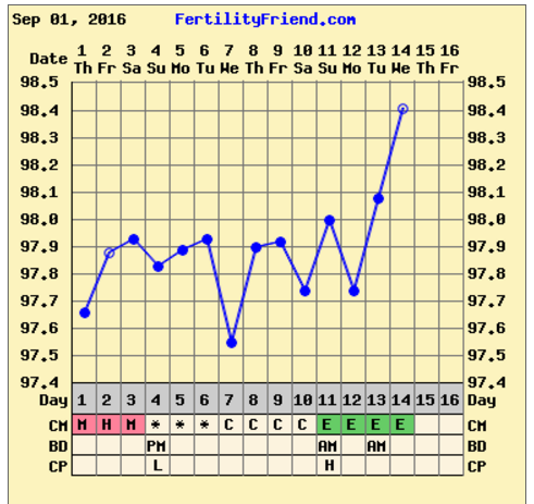 CS/Q: My temps have been confusing this cycle. They are way higher than my normal pre-O temps and it looks like I have a spike, but I still have EWCM. Also I took my temp later than usual this morning (by about 35 minutes) so that could partly account for the high temp. If I put in any more high temps I get solid CH on CD 12. Any thoughts?