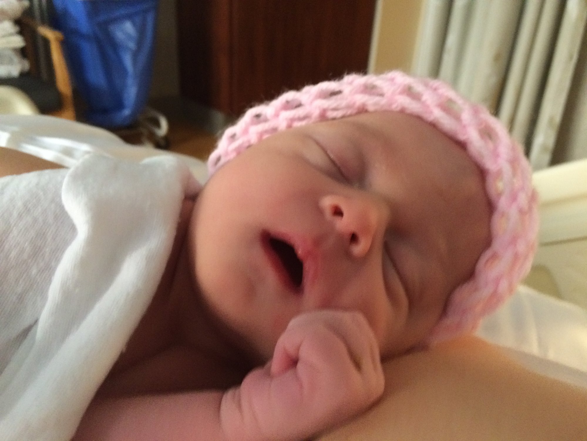 Molly is doing wonderfully - she passes all of her tests. She's breastfeeding with a shield currently (my nipples are stubborn and flat - boo!) but is doing well. She loves being swaddled!