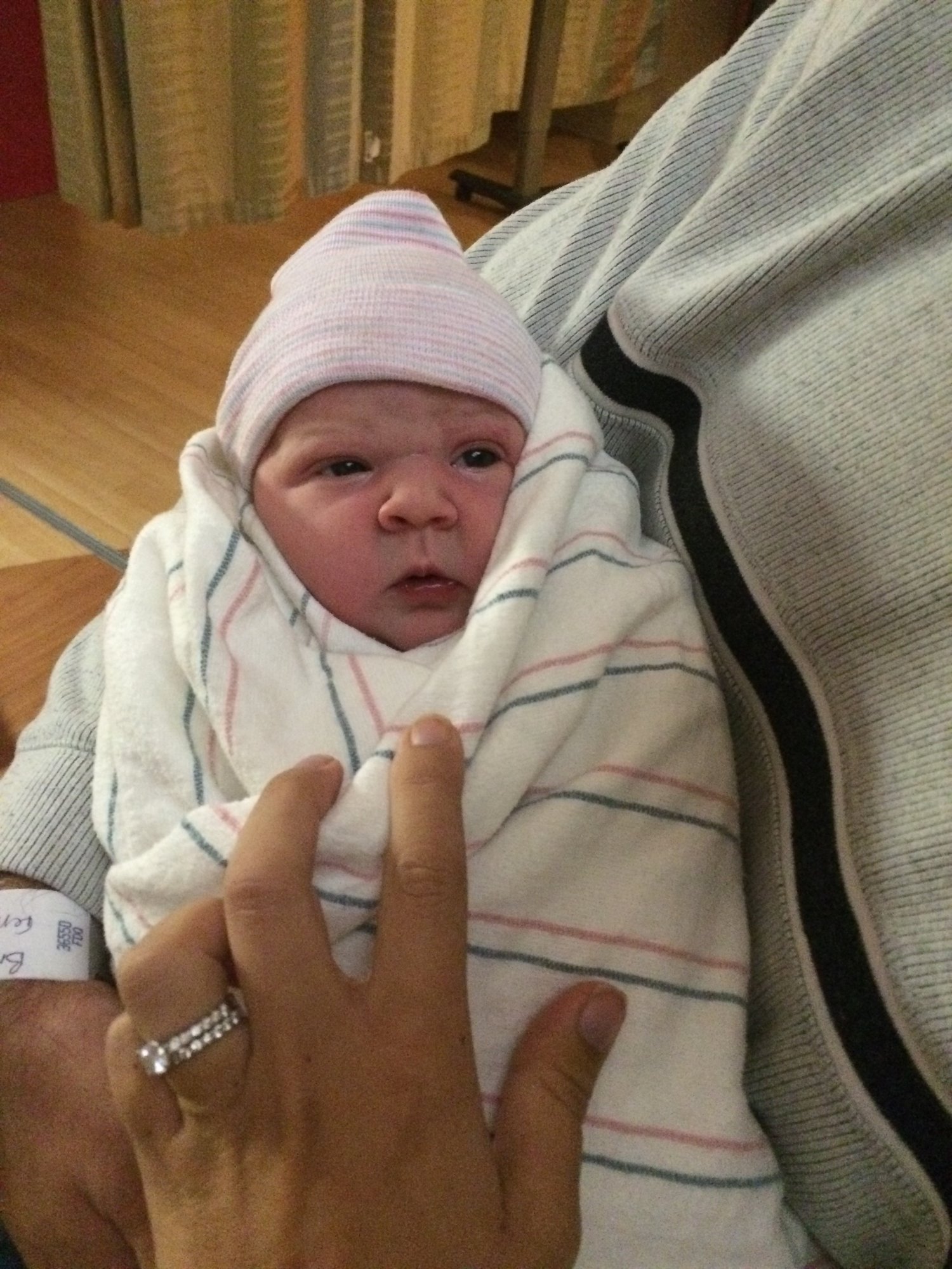 Labor started Saturday night at around 8-8:30pm. Regular contractions which gradually got more intense. I called my OB after alerting my DH and walking around the house to see if the timing was right. She said I should see if I could sleep before going into the hospital. DH and I were trying to watch a movie and I couldn't even lay or sit comfortably on the couch so we figured it was time. Called back again and the OB said go to the hospital. So we made our way there and arrived just before midnight. I got settled and checked and was already at 5cm. We labored naturally for several hours until I got to 8-9cm. The contractions got so intense that it was hard to make it through. I opted to get an epidural at that point but it took over half an hour for him to get to me as there were others before me. Eek. That was not a pleasant experience going through the epidural process itself and all while going through tough contractions. But we did it and I got a lot of relief which was great. I continued to labor to try to move the baby down further. Soon after I was totally effaced and at 10cm. A few hours went by and baby still was far up and not turned. We got to the point where we were going to push. I pushed for about an hour with little success as her little head was stuck on my pelvis and kind of bent back. The OB decided to use the vacuum to get her closer and then she turned her around manually. Once she did that, two pushes and she was out! I couldn't believe it. I made it without any terrible tearing (1st degree tear and interior)! We enjoyed some skin to skin time before I was able to have a shower and she was taken for testing etc. that shower was the best. We went over to the mom and baby unit and got settled there. Everyone is doing well. We get to leave tomorrow morning before lunch. We couldn't be happier!
