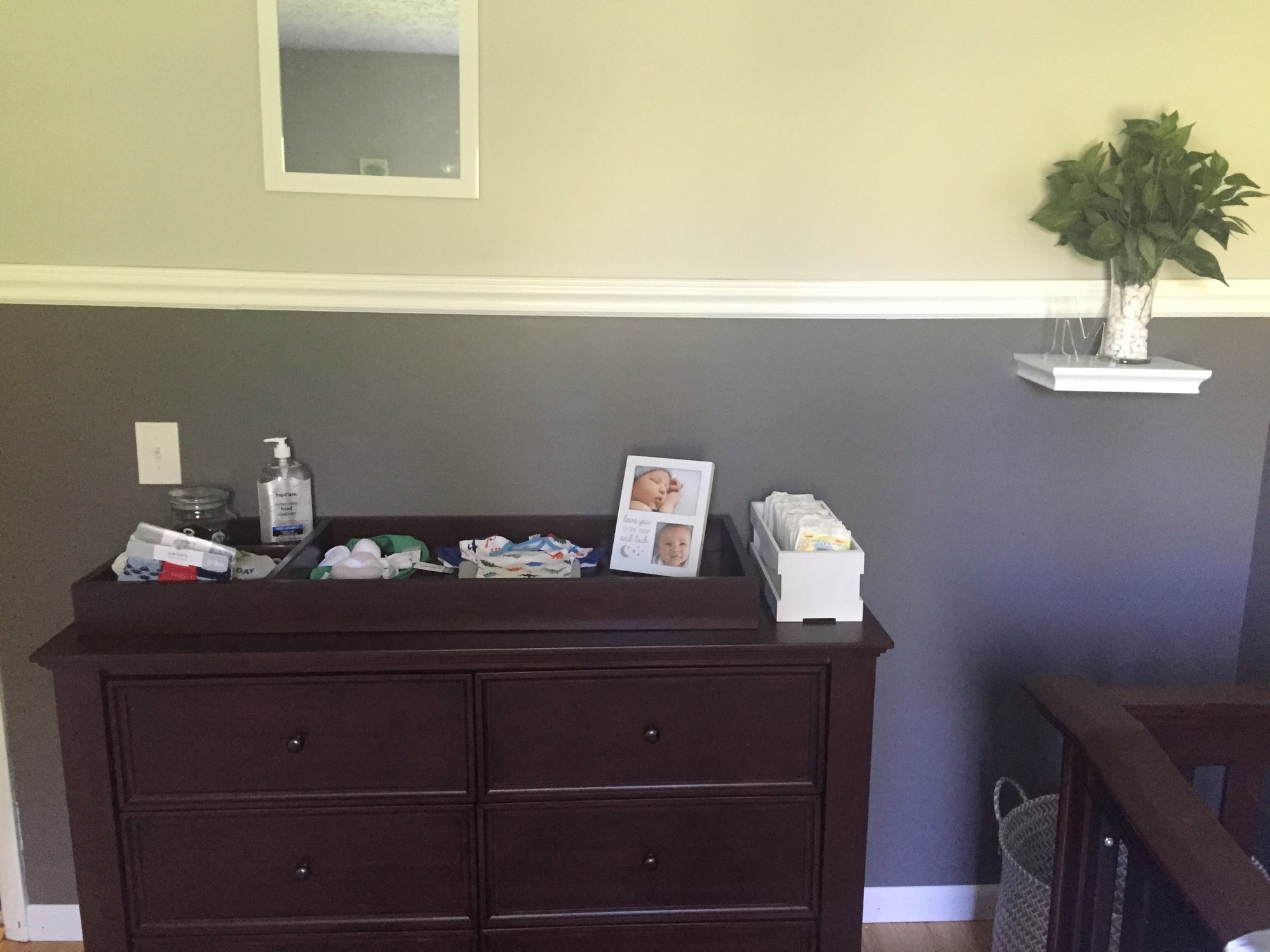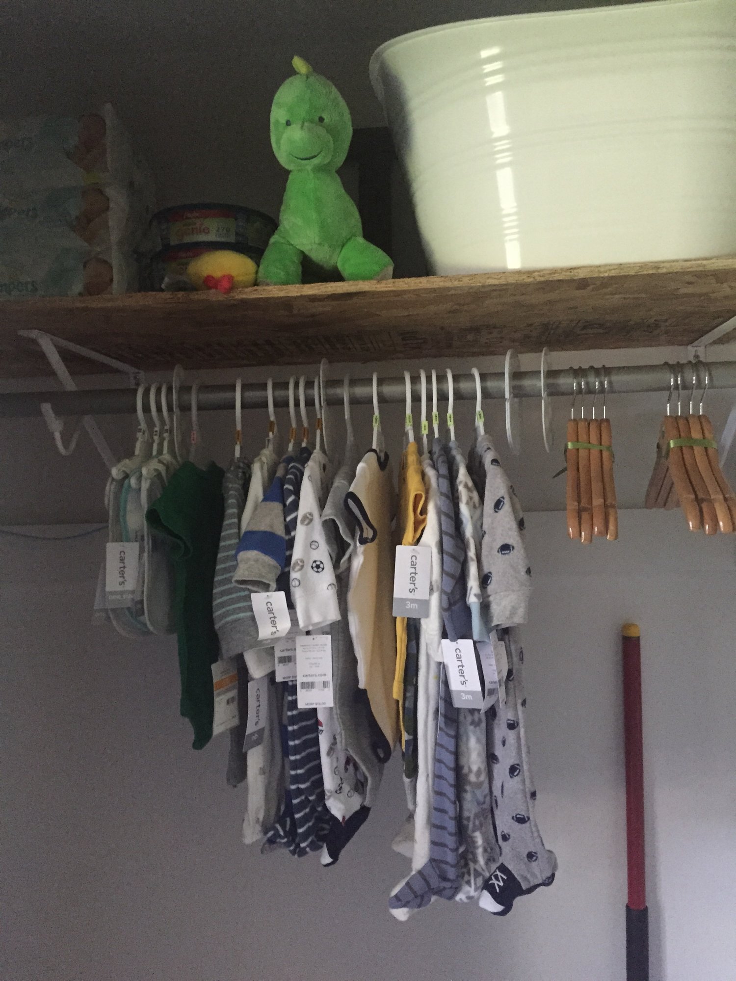 DH actually put up the shelf and rod in the closet (he tore out wire organizers at the start of the remodel), so I was able to start moving all the baby things we've accumulated into the nursery rather than around the house. Hopefully with the nursery set, we can bring everything home from the shower and immediately put it away. ...unlike our wedding shower where we still have boxes in the basement of unused gifts.