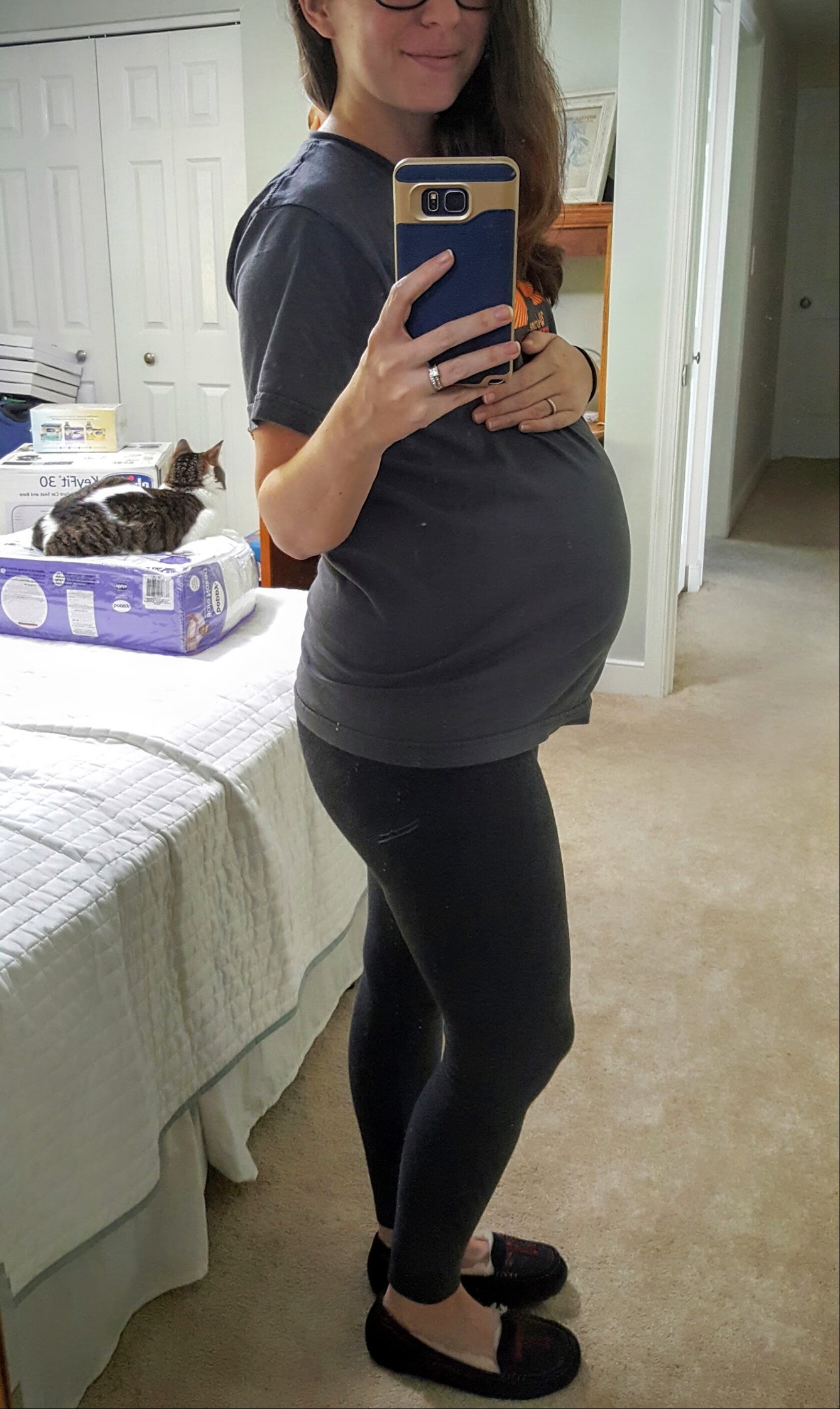 33 weeks, 2 days! This is my current "work from home/not leaving the house til later" outfit... and Penny the cat lounging on our new Boppy (still in plastic case) - such a weirdo!