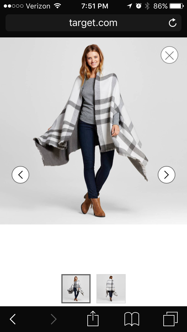 • For those of us who live in less wintery climates, Target has tons of those massive poncho-scarf-wrap thingies on sale right now.  I just bought two and I think they'll take me through most of the winter, and I'll easily be able to wear them post-baby!