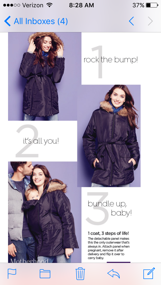 • If anyone lives in a colder climate and is looking at winter coats, this one that Motherhood Maternity just emailed me looks cool! It has an additional "panel" in it to fit the baby bump, then you can remove that panel post-partum so you can still wear the jacket normally and not have it swimming on you, and then you can put the panel back in and wrap it around you and baby! It's a pretty cool idea so that your money is put to good use long-term!