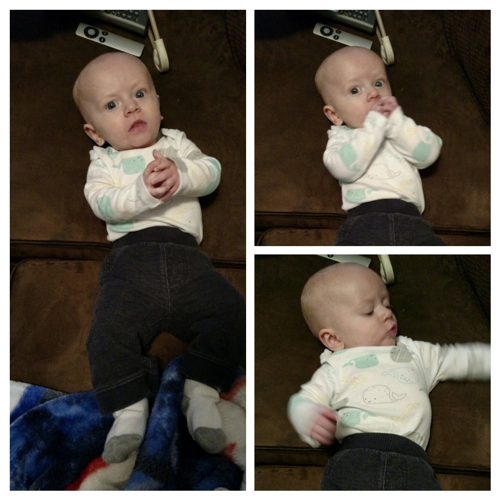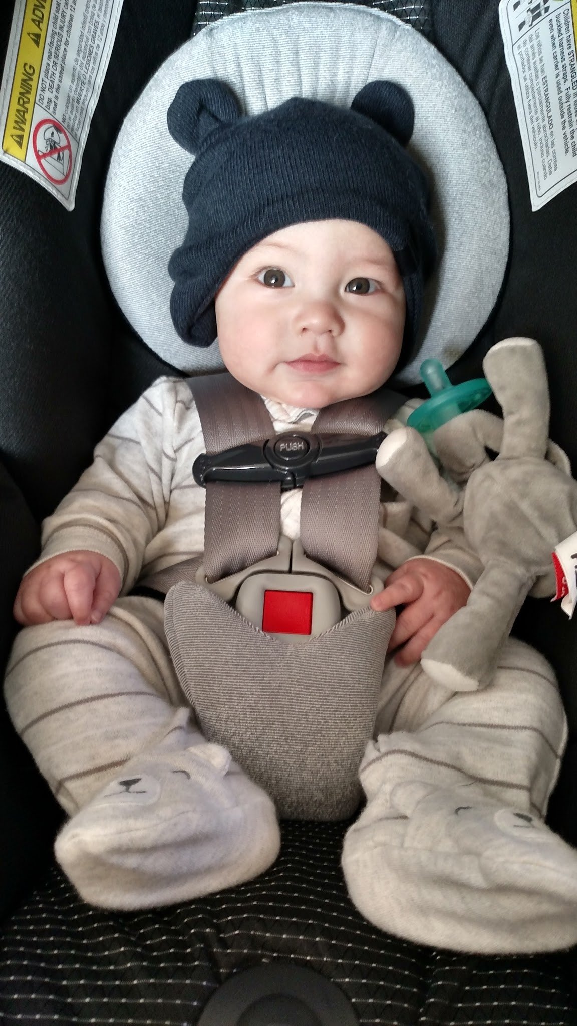 Tristan just turned 20 weeks on Sunday and had been battling croup... Poor little thing. His spirits seen to be mostly intact though. He is rolling over, sometimes both ways and sleeping about 7 hours straight through the night. Here he was yesterday getting ready to head to daycare.