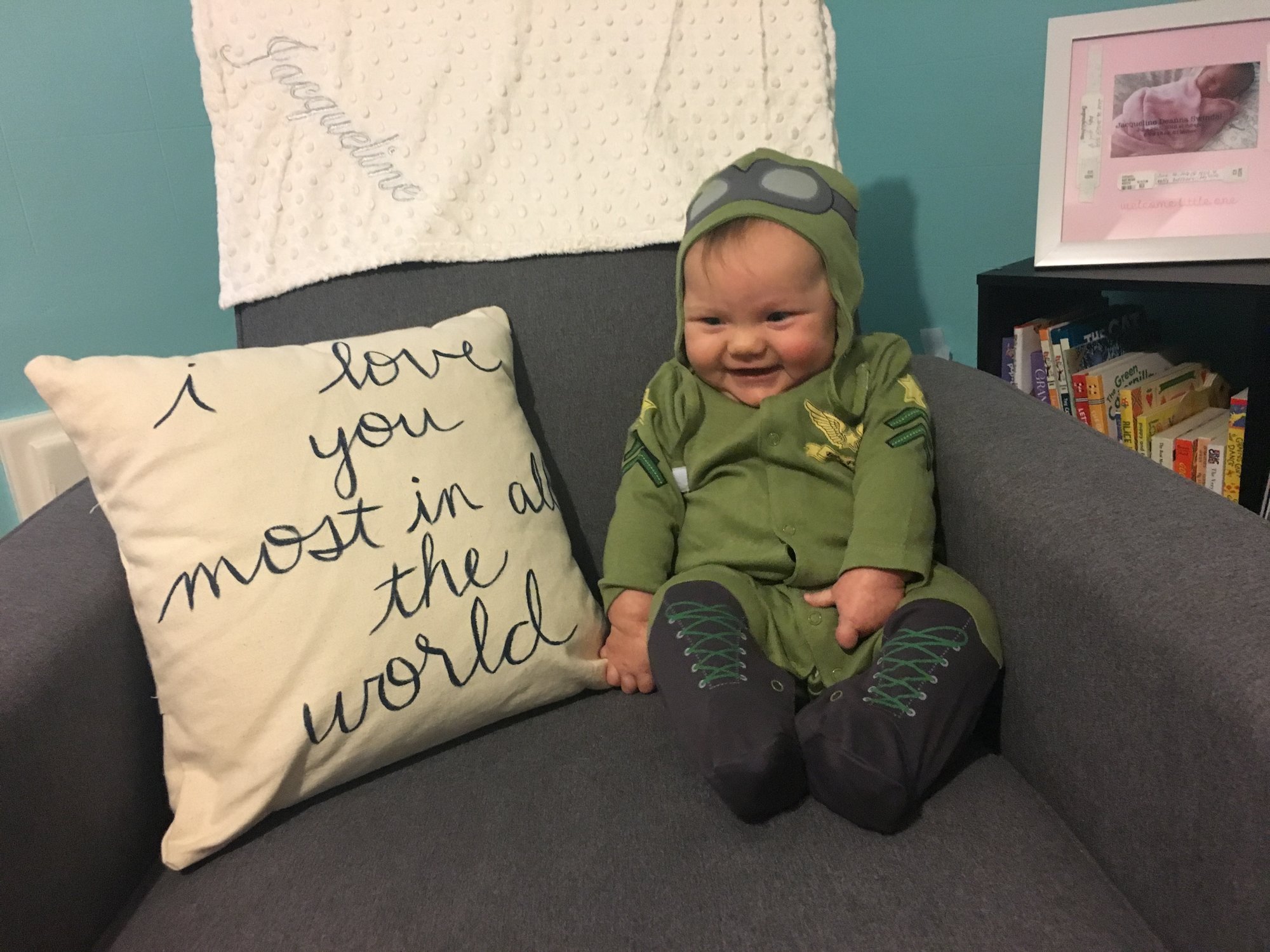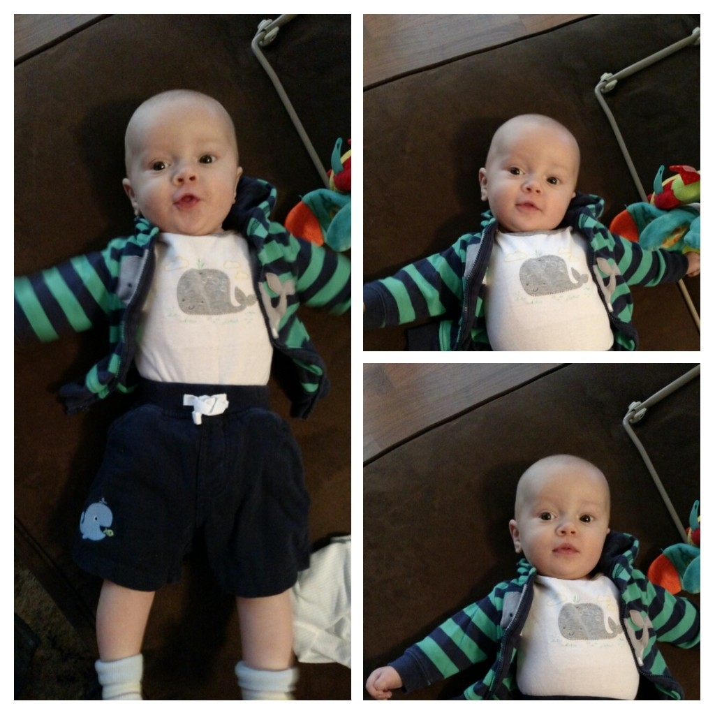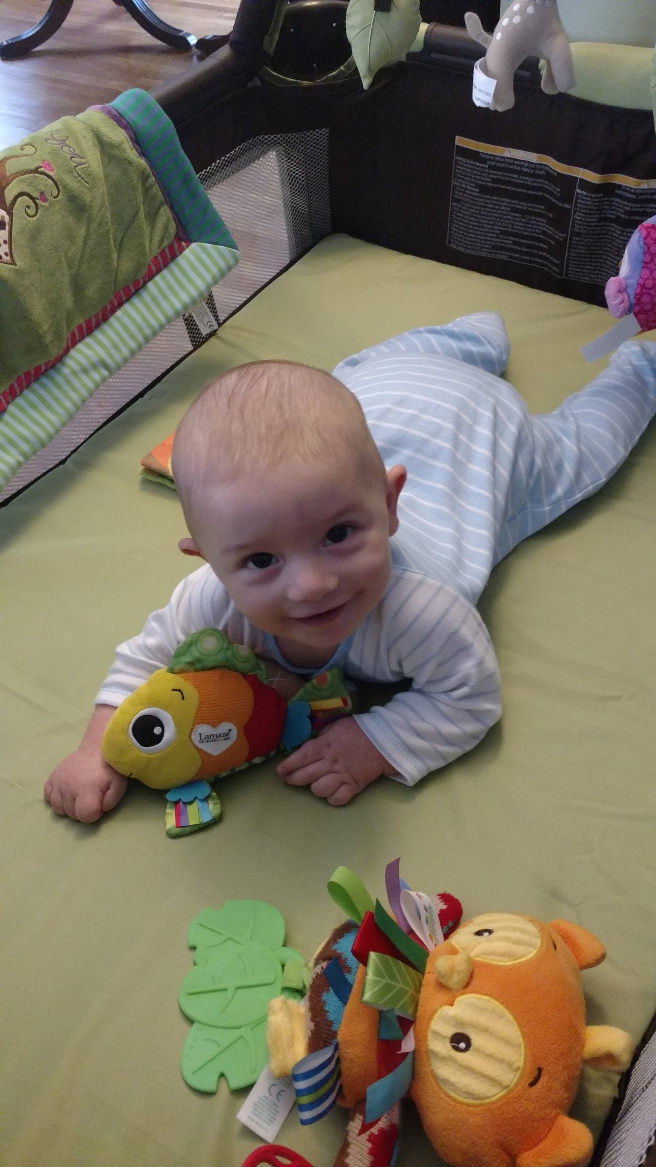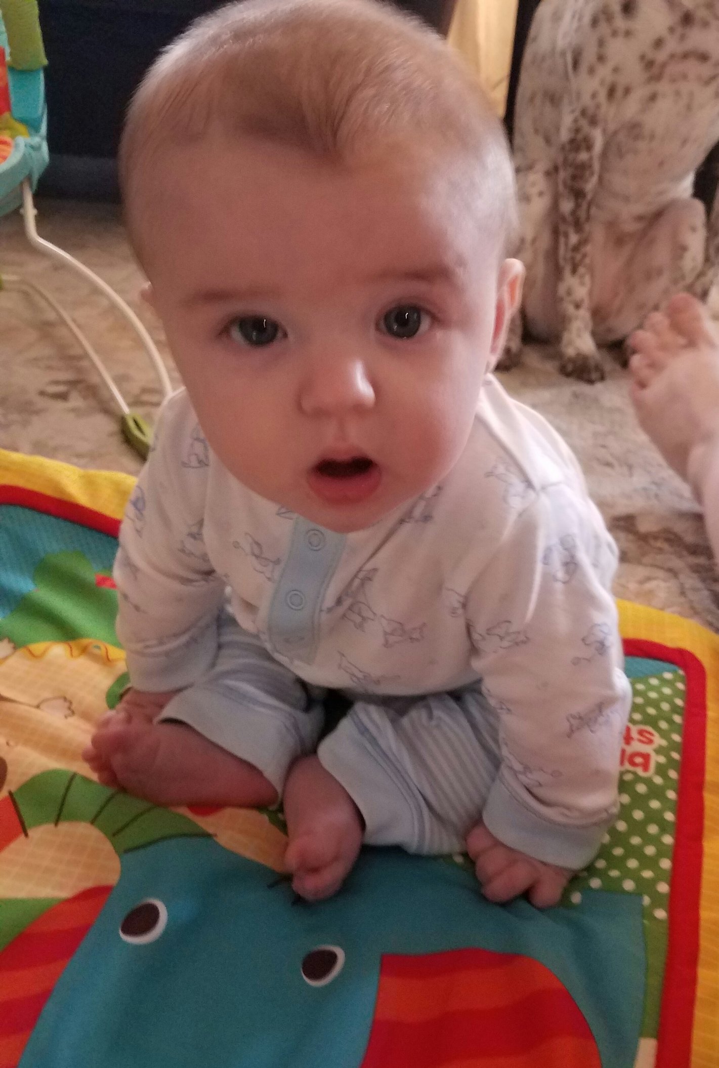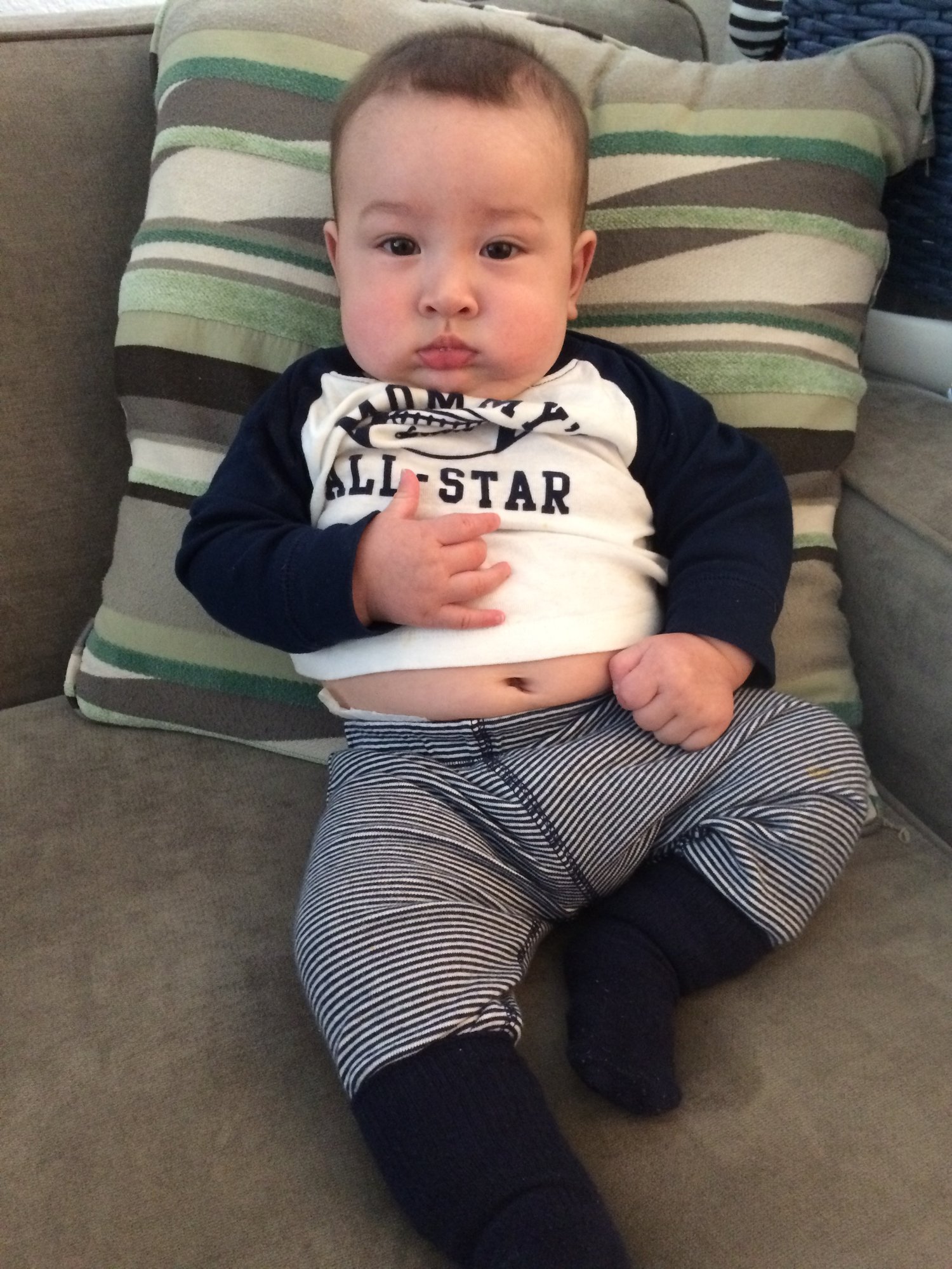 Oliver will be five months old on Halloween. He loves blowing raspberries and spit bubbles.