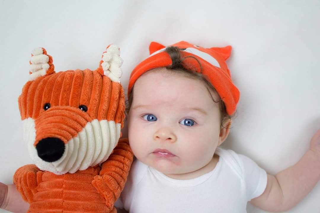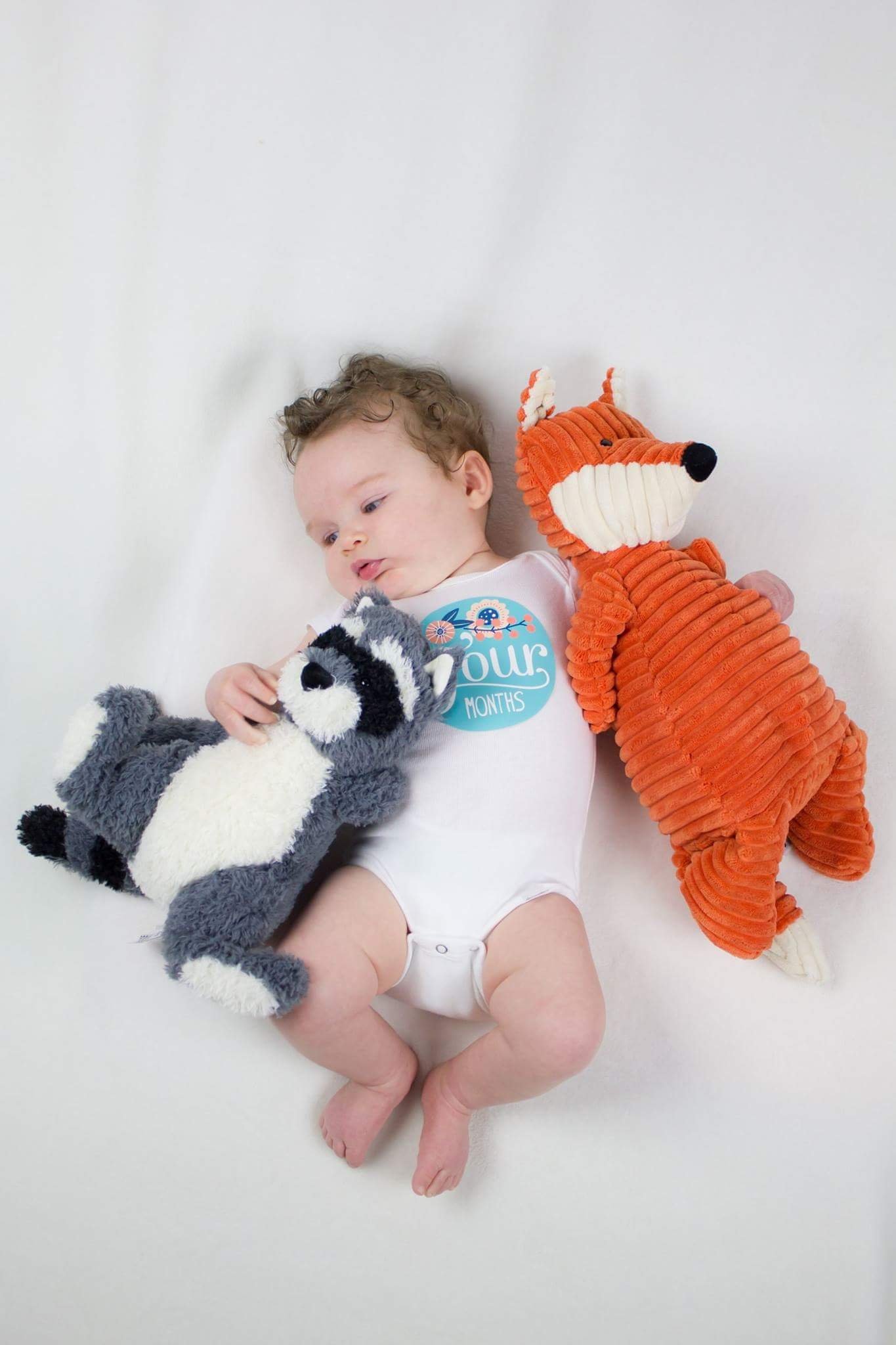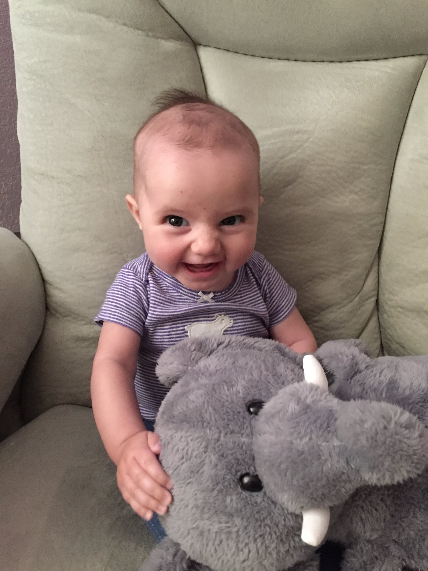 Charlotte is 20 weeks, she's become very aware of what's going on around her and will only finish a bottle in her room. If I try to feed her somewhere else she eats an oz and acts like she's done but 2 mins later she acts like she's starving. This is her new elephant and she's very excited to chew on him.