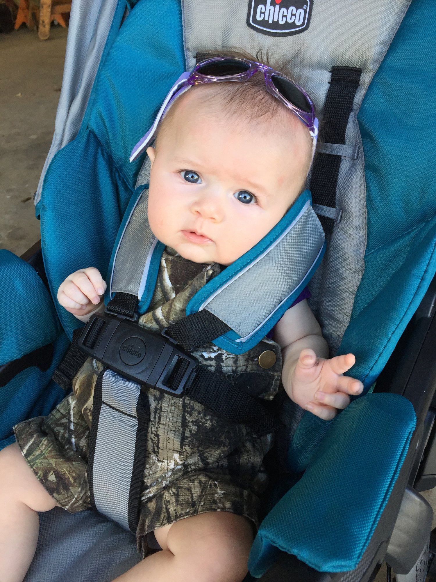 We entered a photo contest this week for gerber milestone babies. (Bottom photo used) The top photo was her 9 month outfit we had to get to replace her 3-6 month size Halloween costume that doesn't fit. The bottom was taken at my inlaws in their backyard. She loves riding in her stroller even if it's just around the backyard. 18 weeks and did very well with her shots Monday for her 4 month check up. Our big girl is so good we are very blessed.