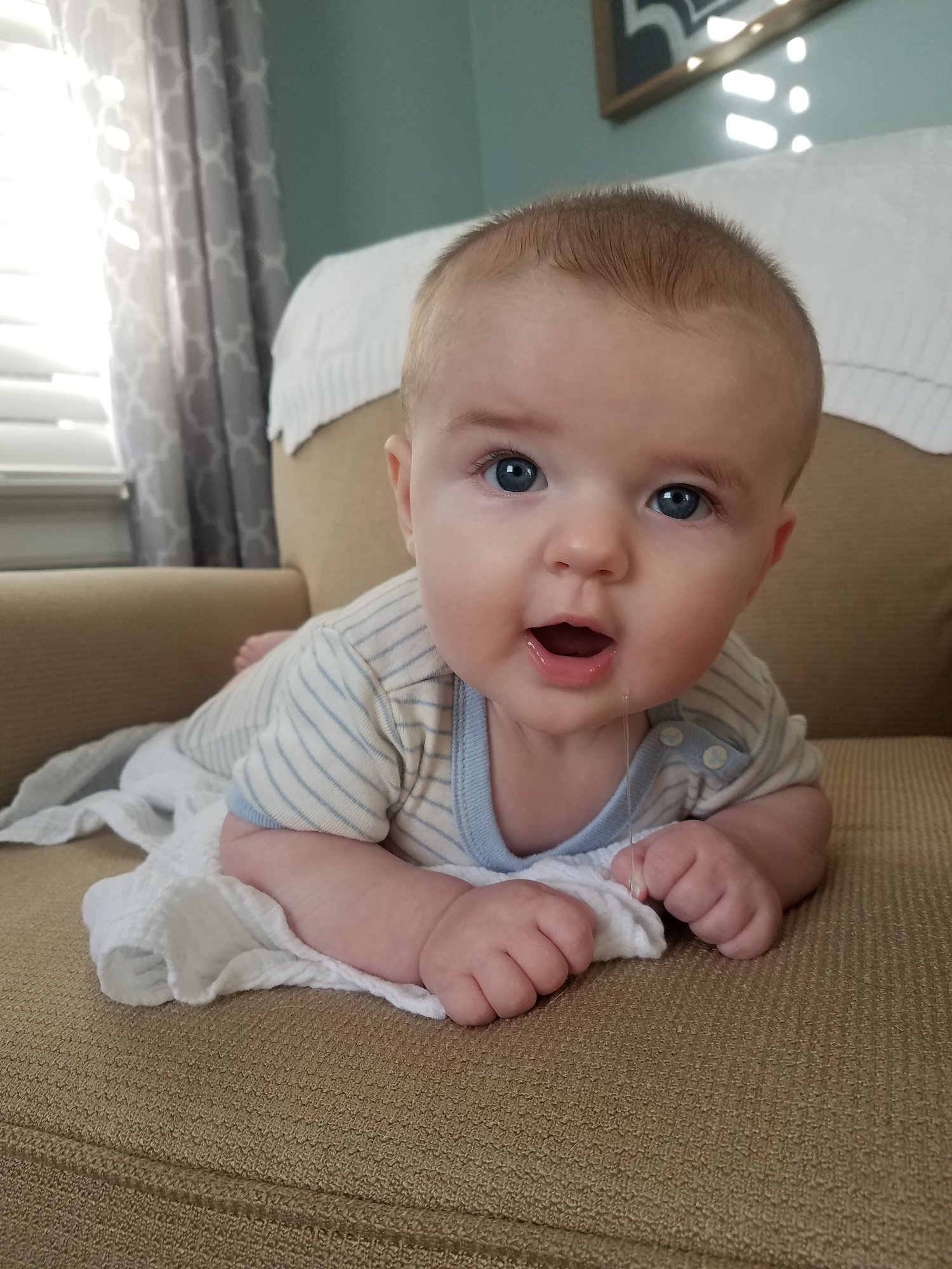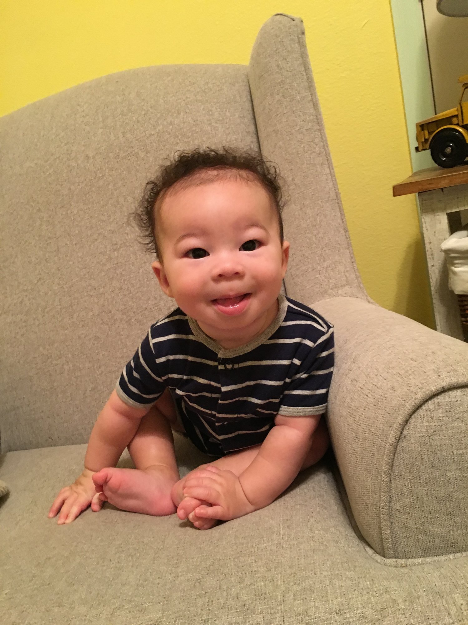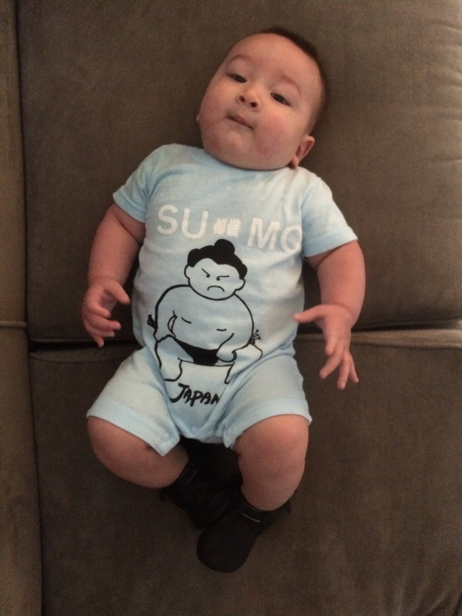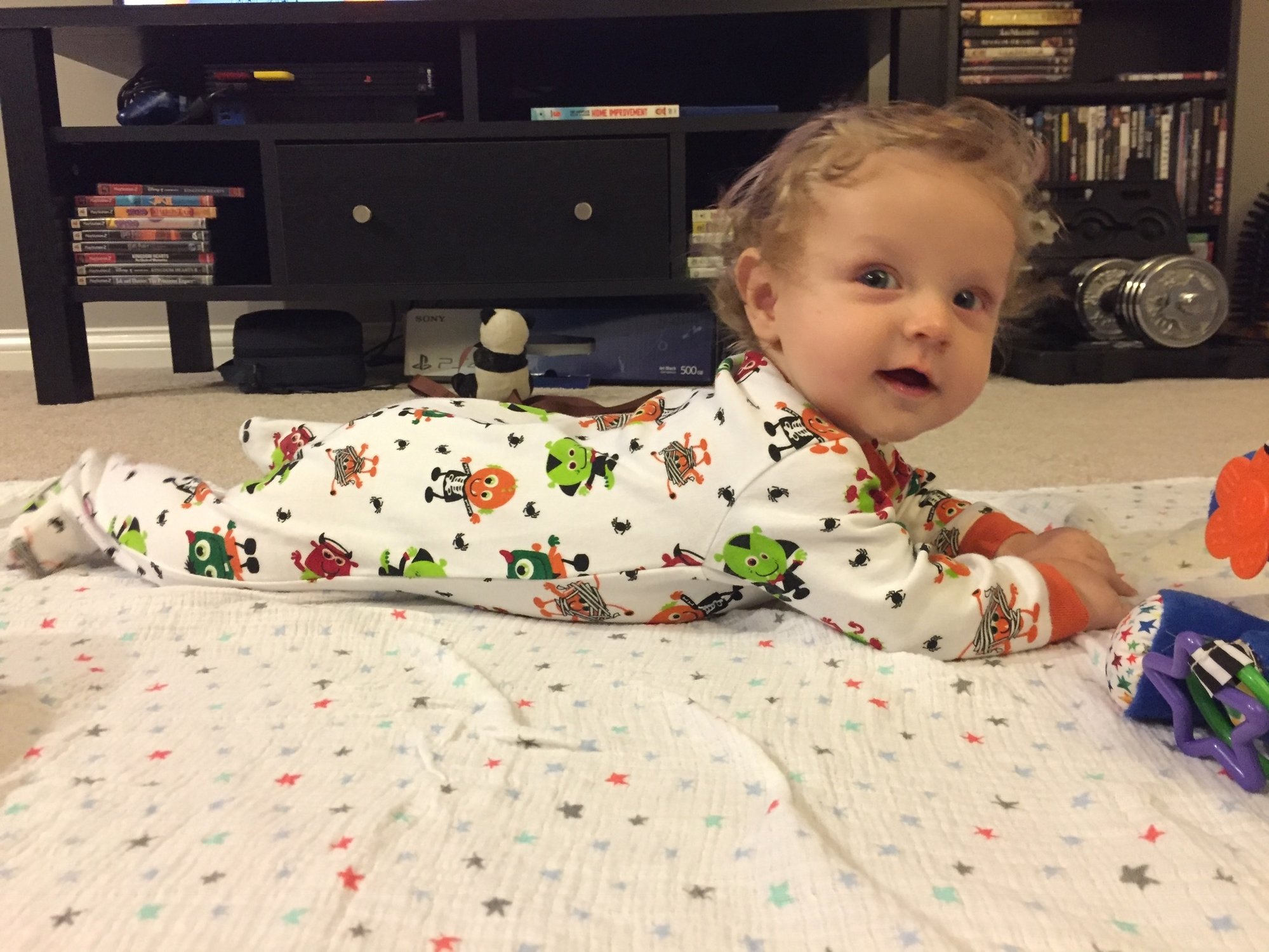 Miles is… Miles is old. 4 1/2 months, I can't keep track of weeks anymore. Miles loves tummy time (for about 20 minutes at a time), his feet, and messing his diaper as soon as I get him in his car seat Kid did some barrel rolls for us Monday night and ended up across the room in 30 seconds. Amazing, but scary to see how fast he can move when determined