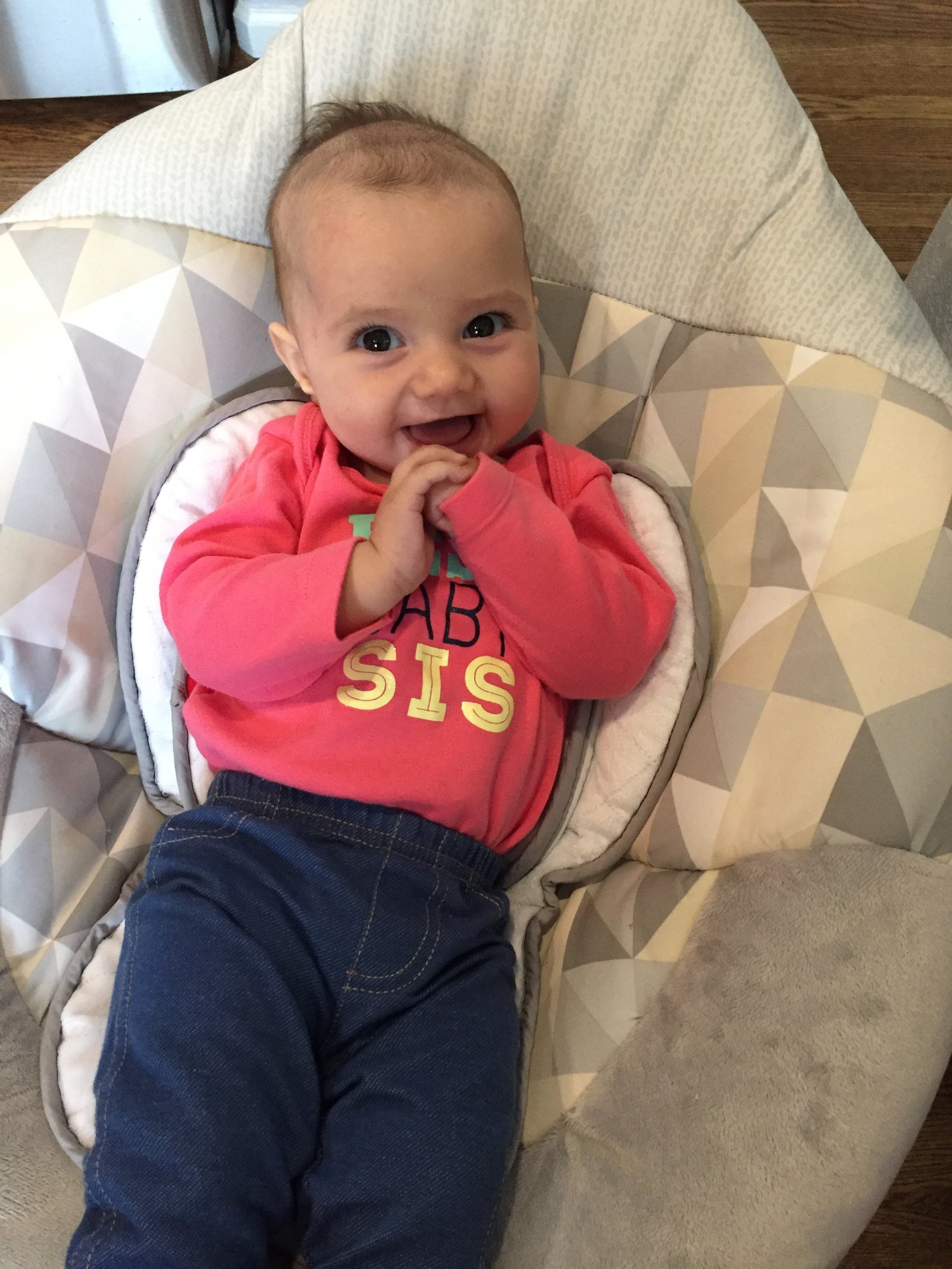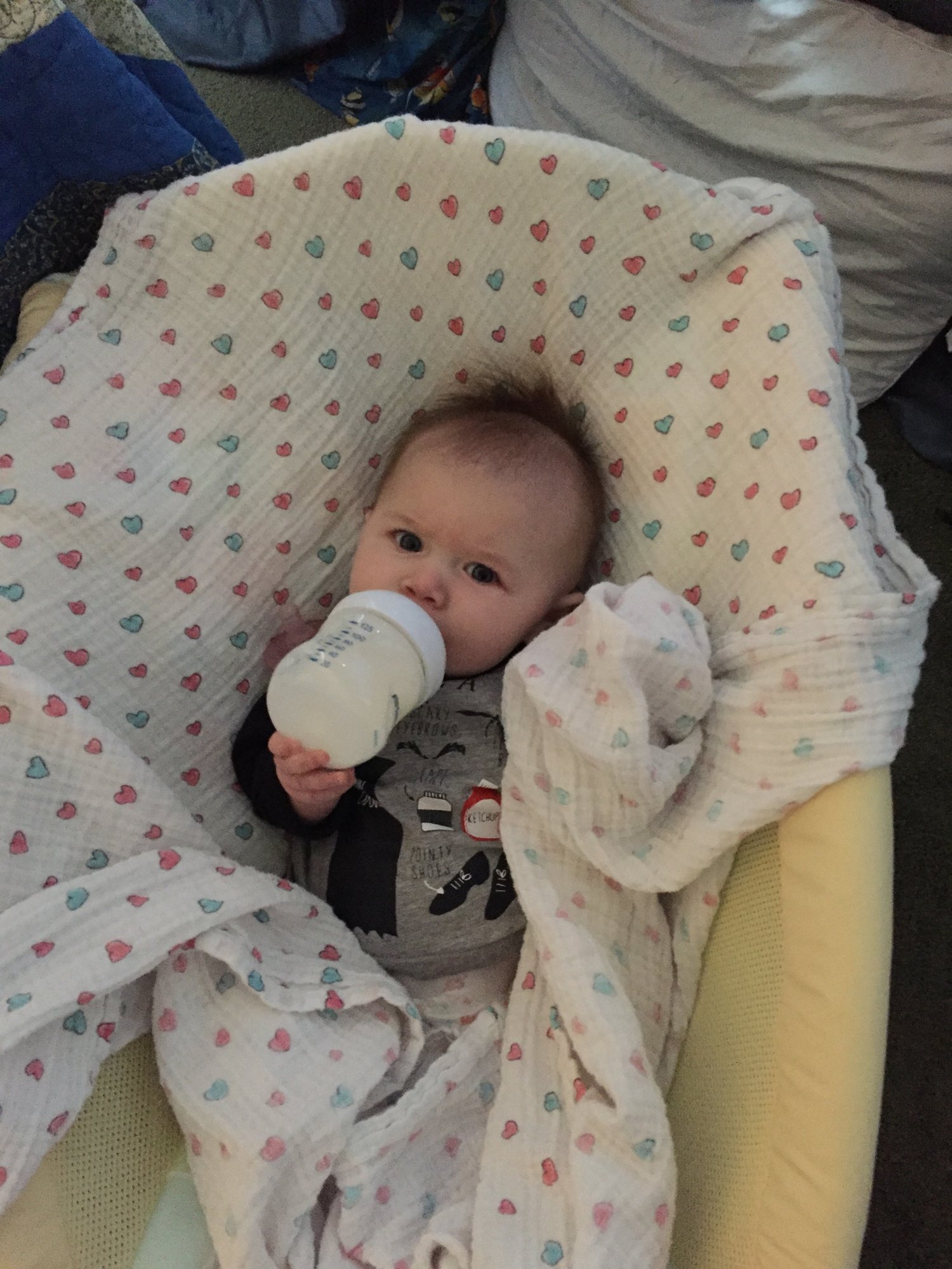 Lily was 19 weeks yesterday and is loving the cool weather. Peeking over my shoulder and trying to chew on my arm. She has also decided to show off her bottle skills.