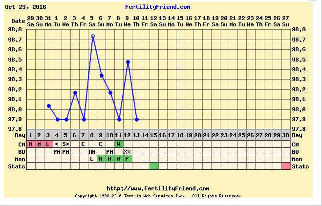 @Dilynne looks like there is a temp shift, I would see what the next few days of temps do. Ever check cm or use OPKs?