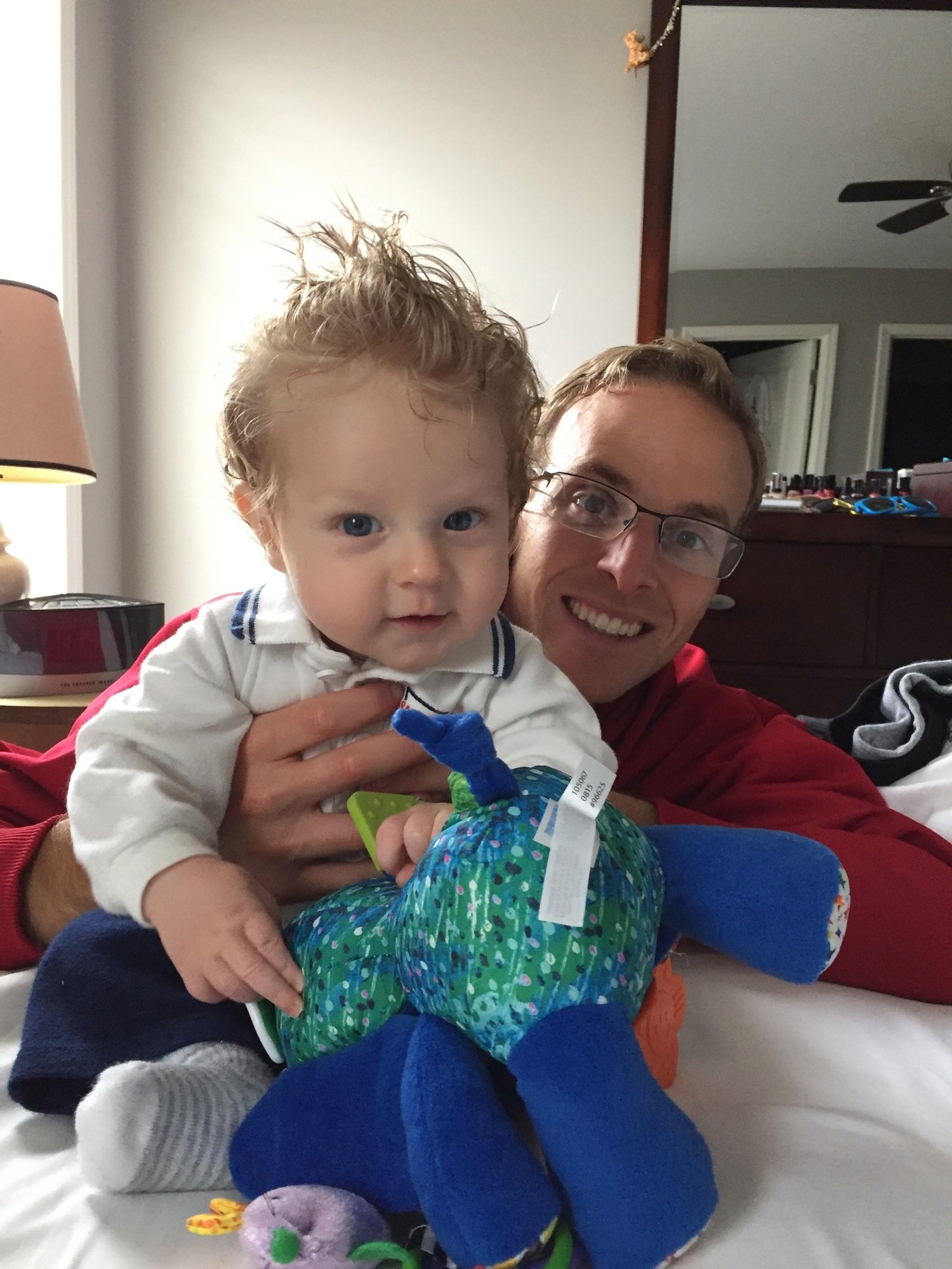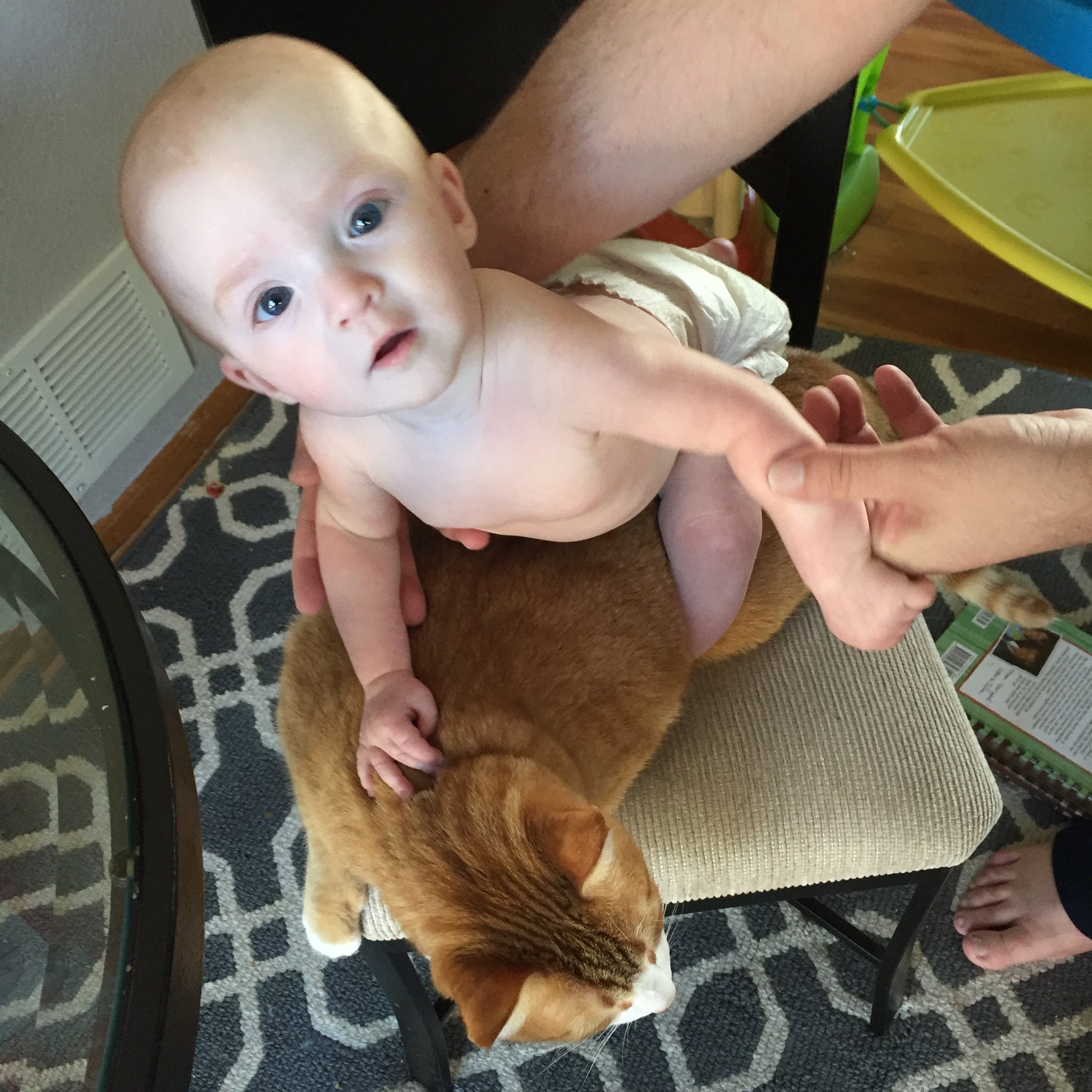 Cameron riding the giant kitty cat. He has a lot of growing to do to catch up with Oliver, he is 17 lbs!!!