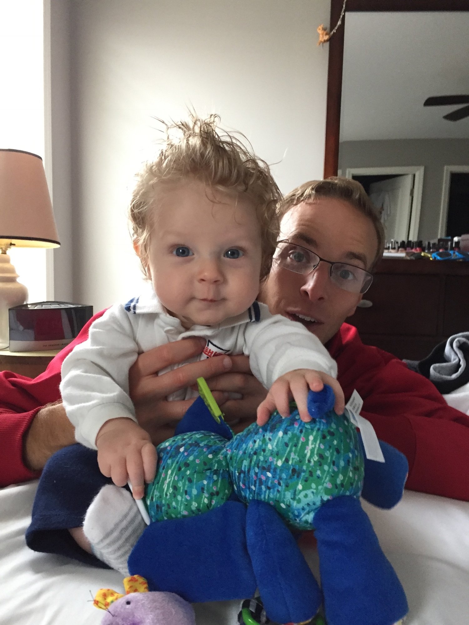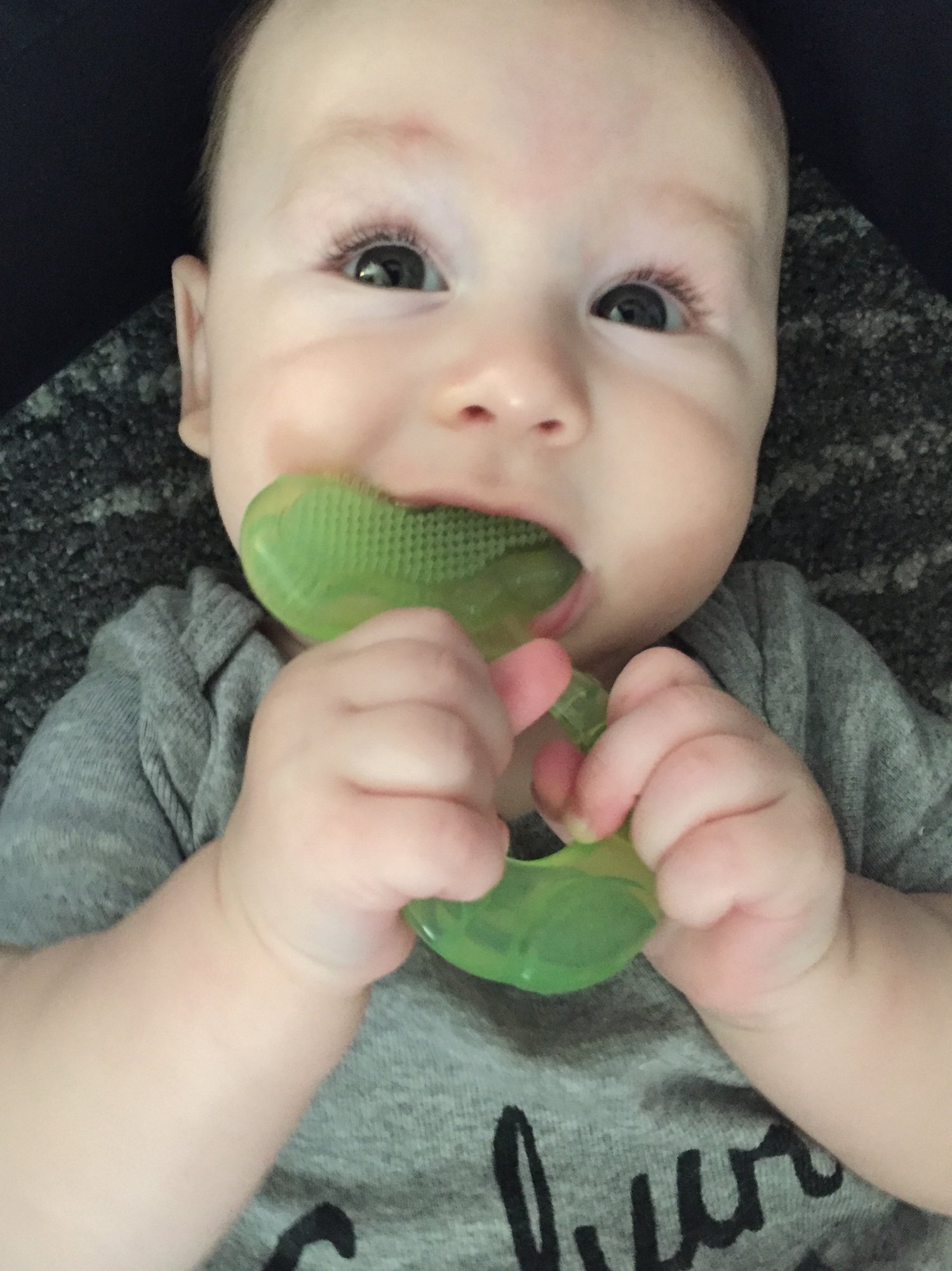 Miles is 5 months on Saturday! DH had fun with his hair this weekend, there is just so much of it. Miles barrel rolls in all directions, can sit unassisted for about 30 seconds if I position him correctly, though he's a little angry by the end. He's also learning to dance, loves to lean himself back and forth when you hold him facing out