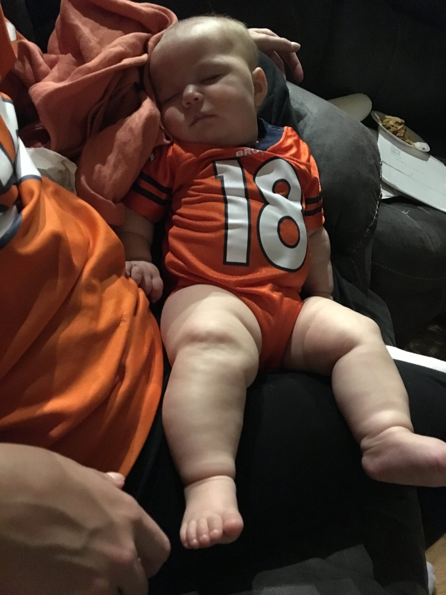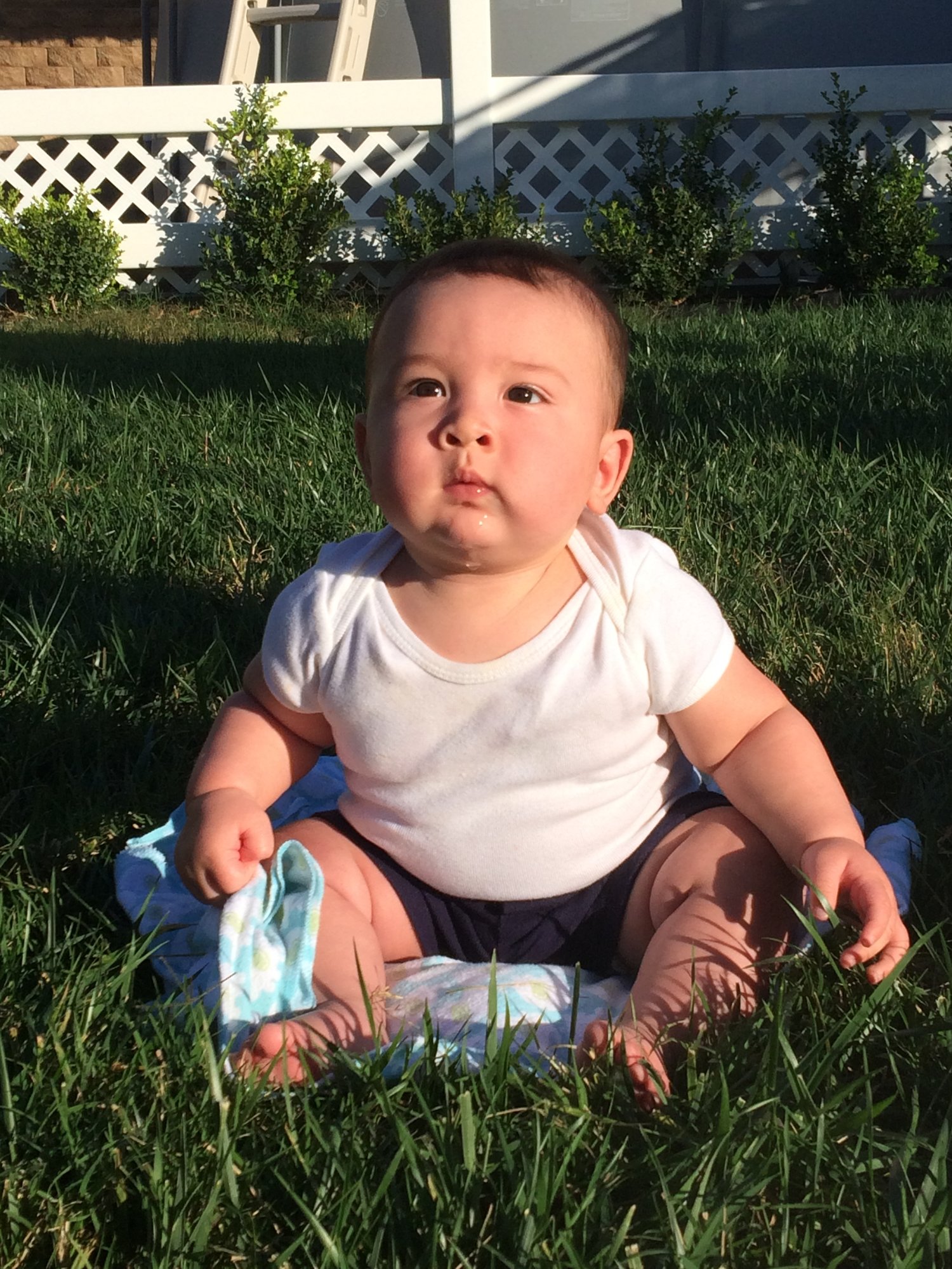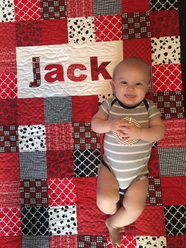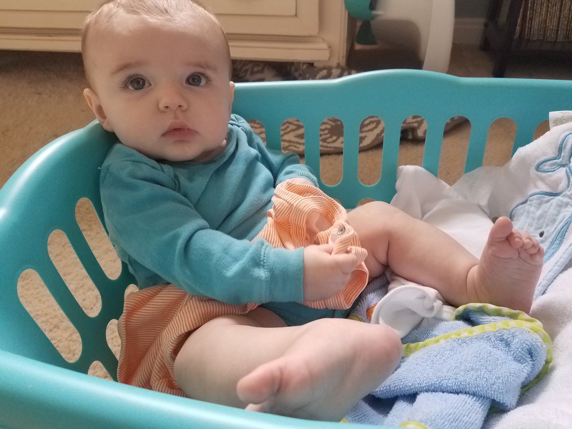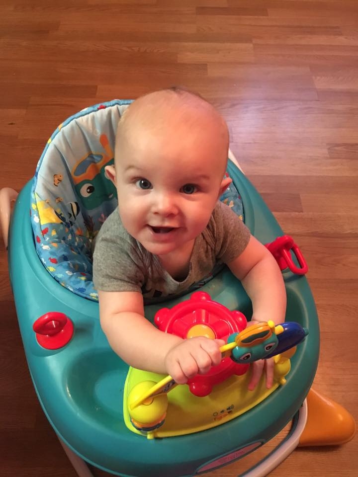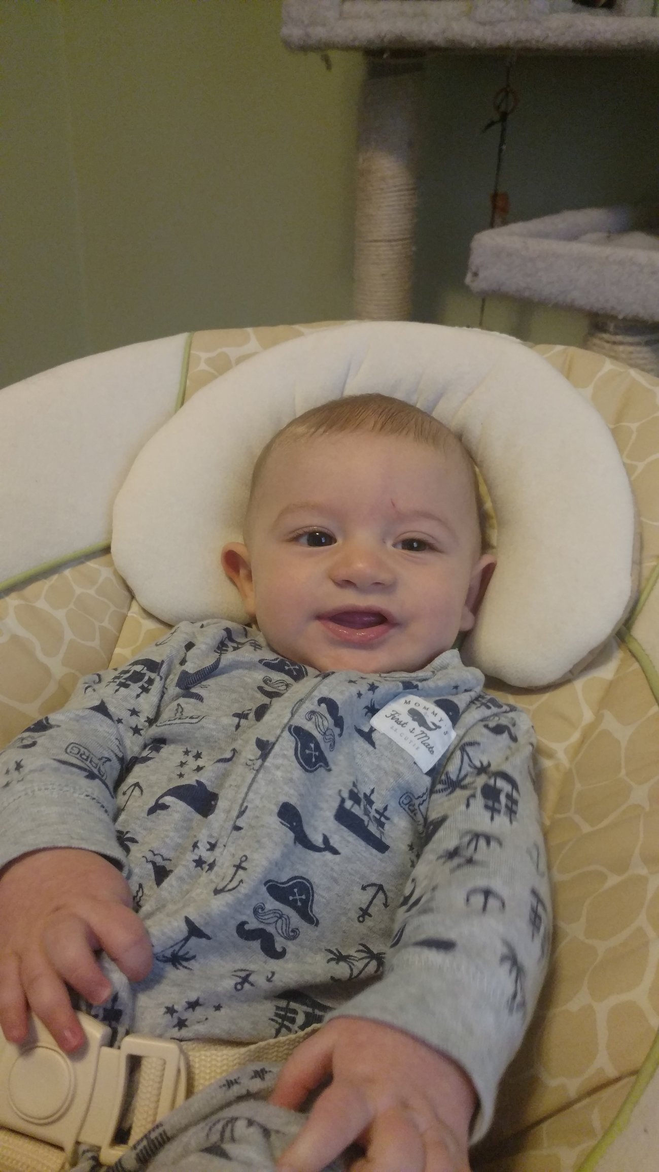Jack was 5 months last week. He is rolling from his back to his tummy but not from his tummy to his back.. He LOVES to chew on his right foot and is starting to walk a little bit in his walker! He is 19 pounds!!