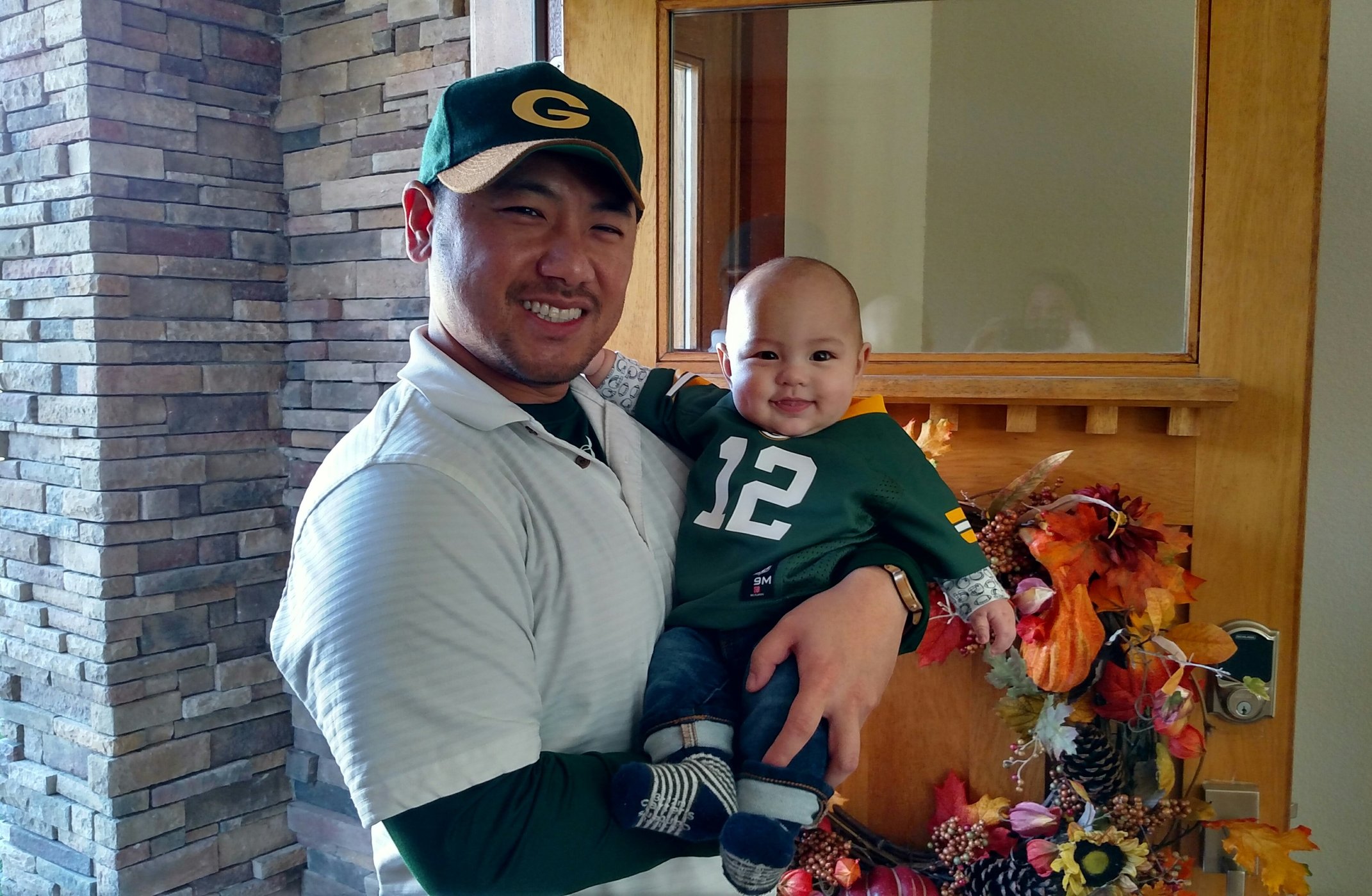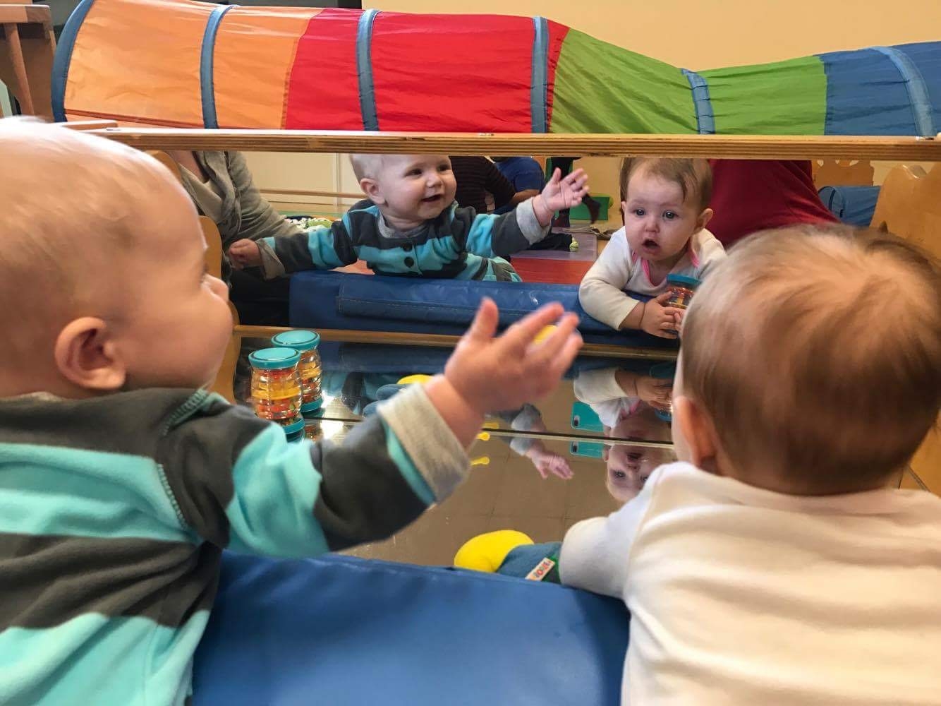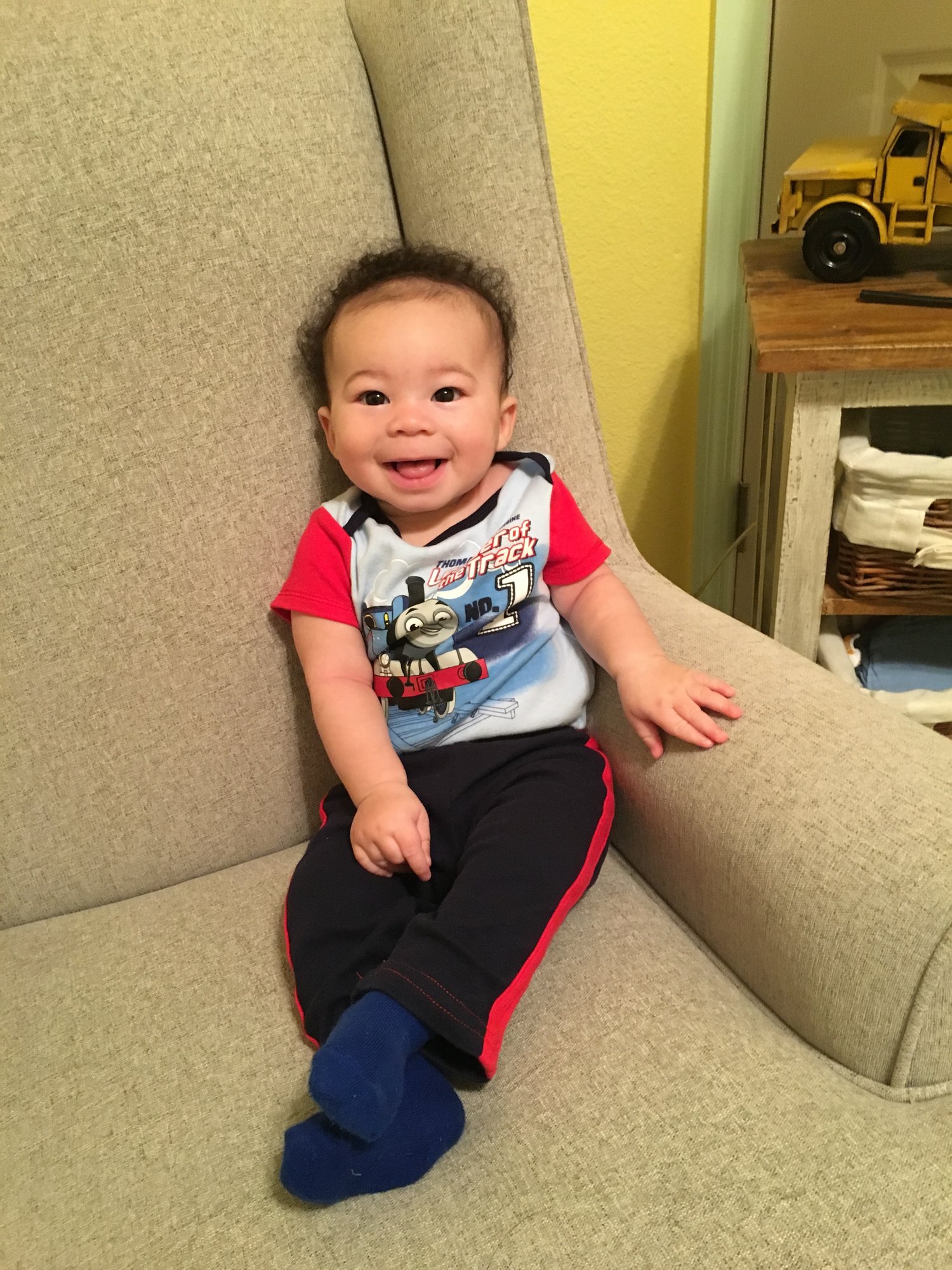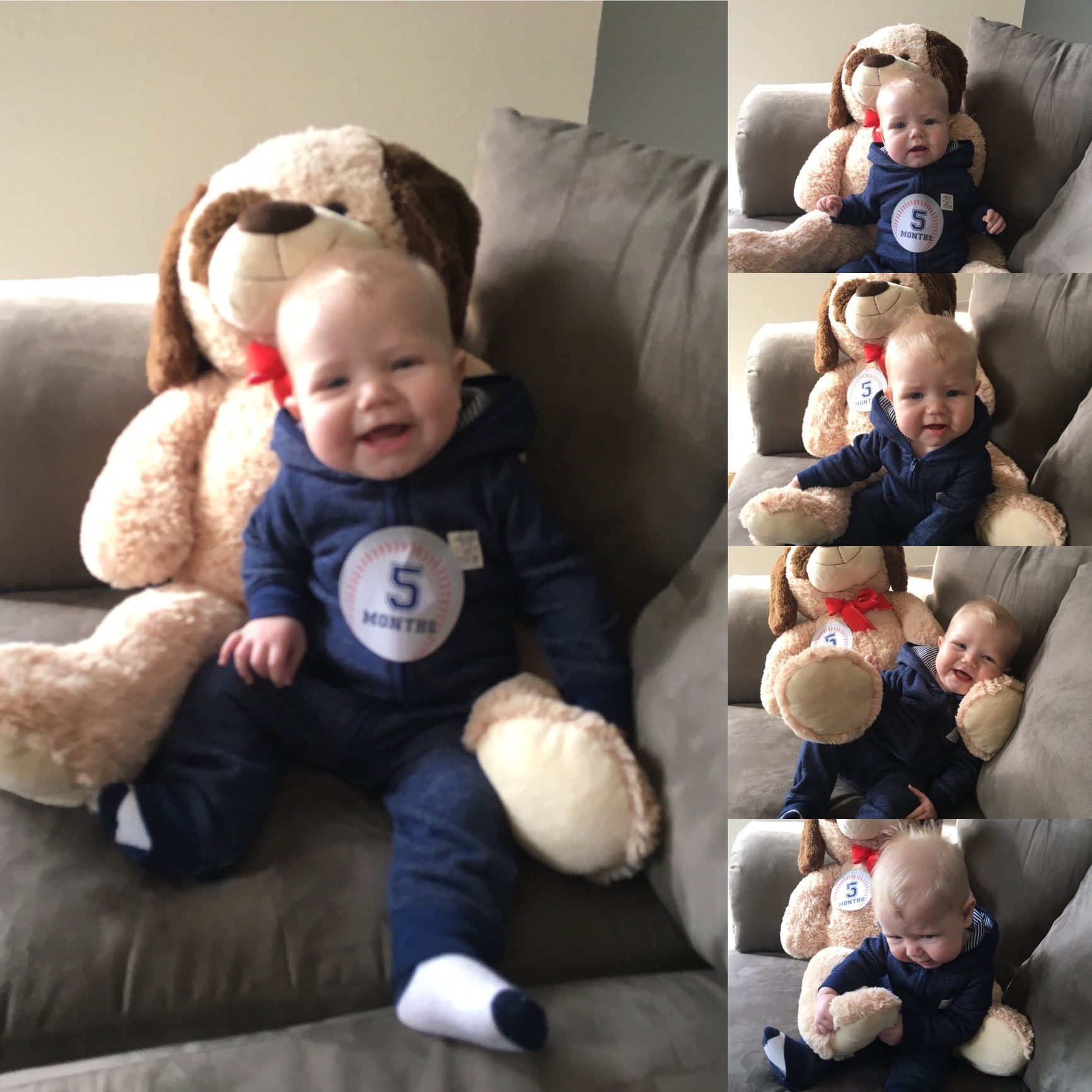 Sam playing with his friend at Gymboree and his 5 month picture.