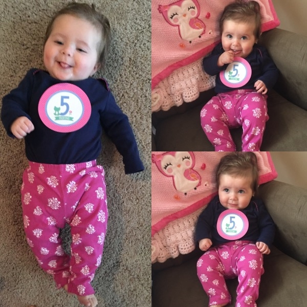 Charlotte was 5 months last week. She's still trying to figure out how to roll from her stomach to back but the back to stomach roll is easy for her. She's growing so fast it makes me a little sad some days.