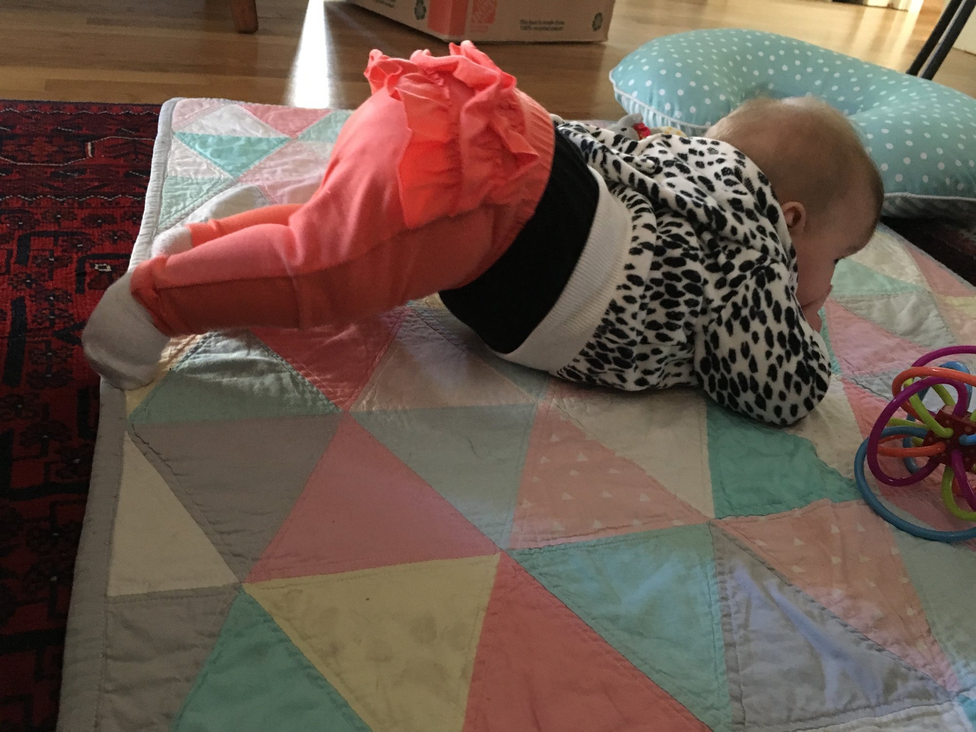 Jackie has started doing full push-ups and wiggling all over the place. 4 1/2 months.