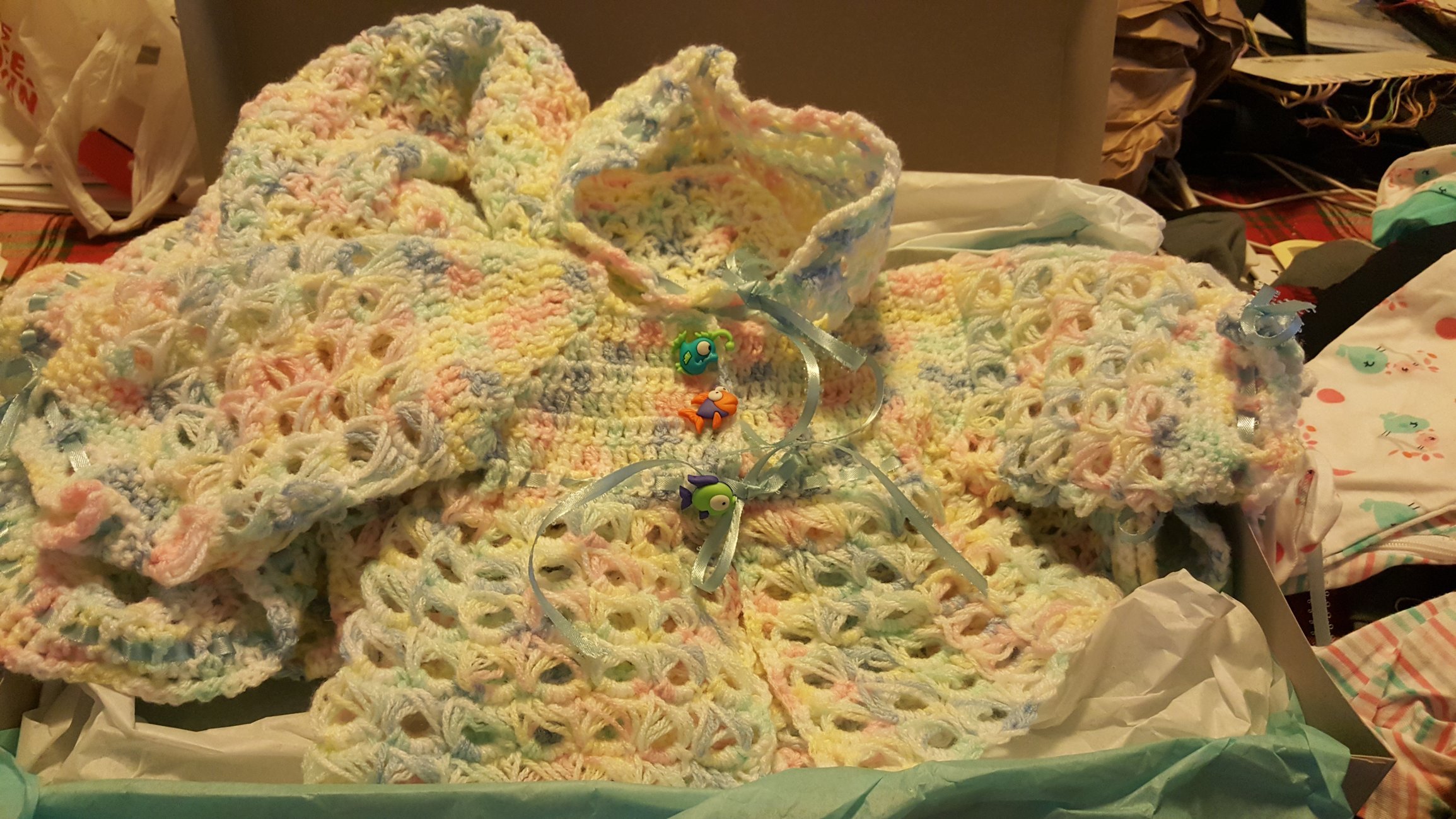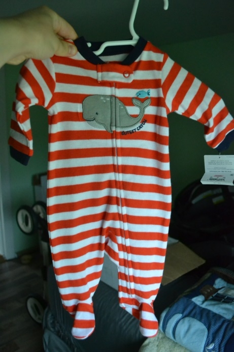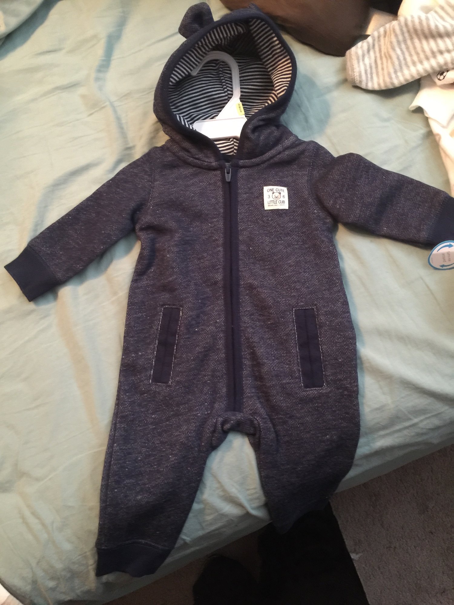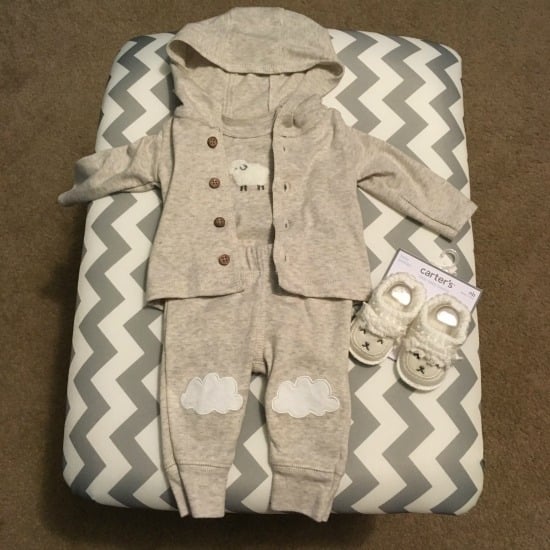 My grandma claims it's tradition to let DH pick baby's coming home outfit. Which scared me a bit bc I thought we'd need to pick a boy AND girl outfit...but he found something that will work for either. I found the booties later and will just make a hat. And since some of y'all posted Christmas outfits too, I had him pick one of those while we were at BRU (we drove 3.5 hours to look at strollers and actually have variety, so I took advantage of having more clothing selection!)